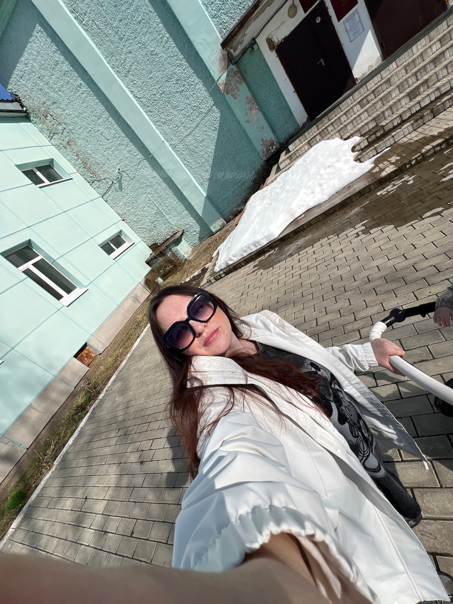 A selfie taken at an extreme angle shows a young woman in sunglasses and a white jacket on a paved walkway in Noviy, Russia. The walkway is bordered by a light blue building with windows and, on the o…read more