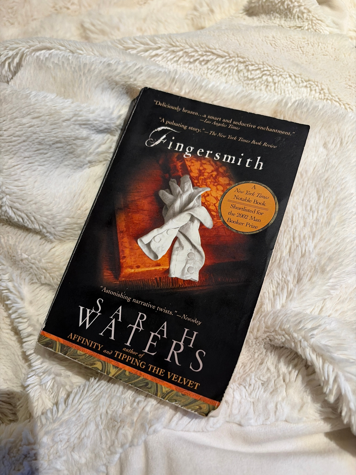 The image displays a copy of the novel "Fingersmith" by Sarah Waters, resting on a soft, cream-colored, fluffy blanket or throw, suggesting a cozy, relaxed indoor setting in Amsterdam, Netherlands. T…read more