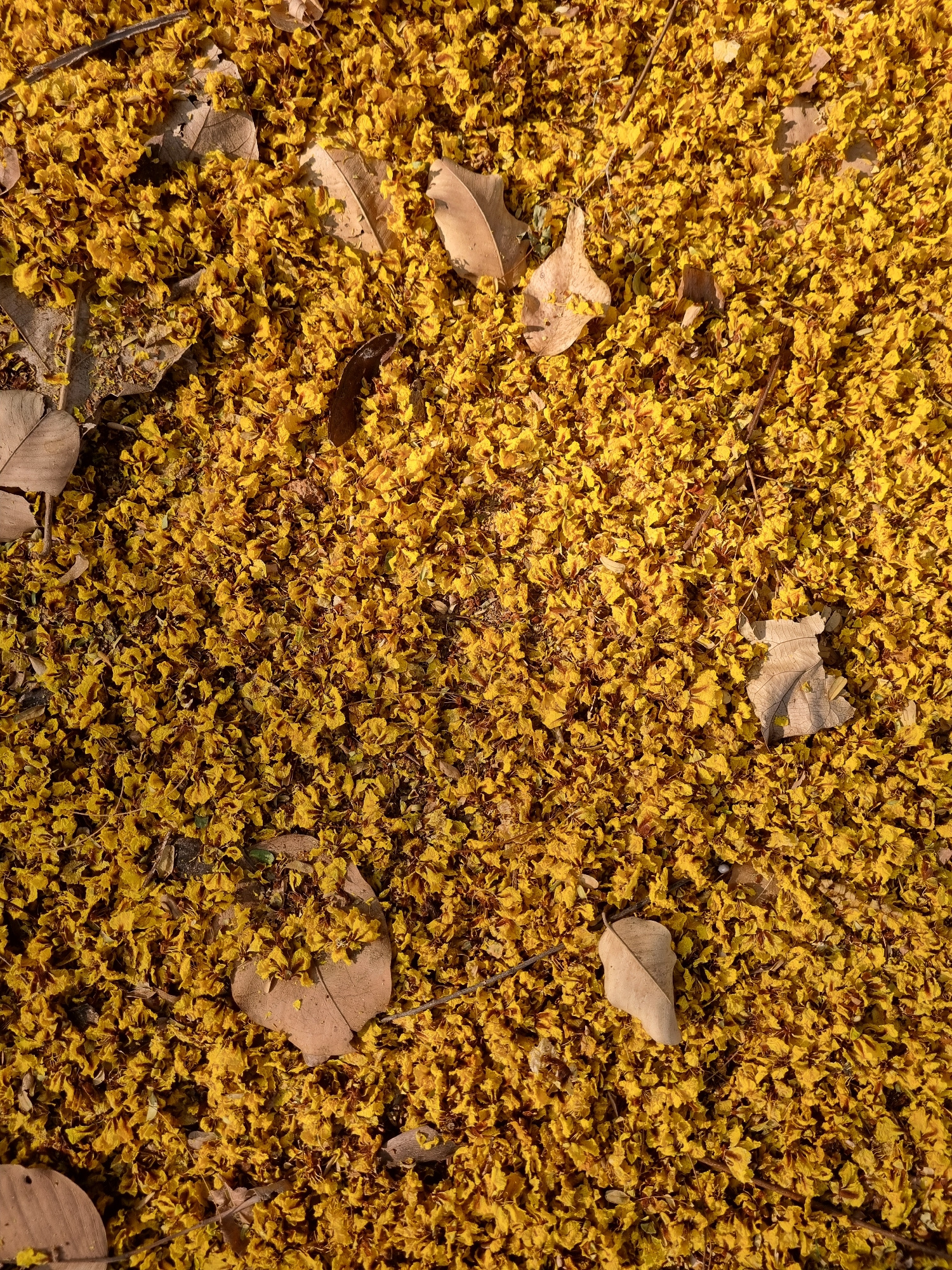 The scene, located outdoors in Puttaparthi, India, depicts a ground surface completely blanketed by a dense accumulation of small, crinkled yellow petals. Interspersed within this floral layer are sev…read more