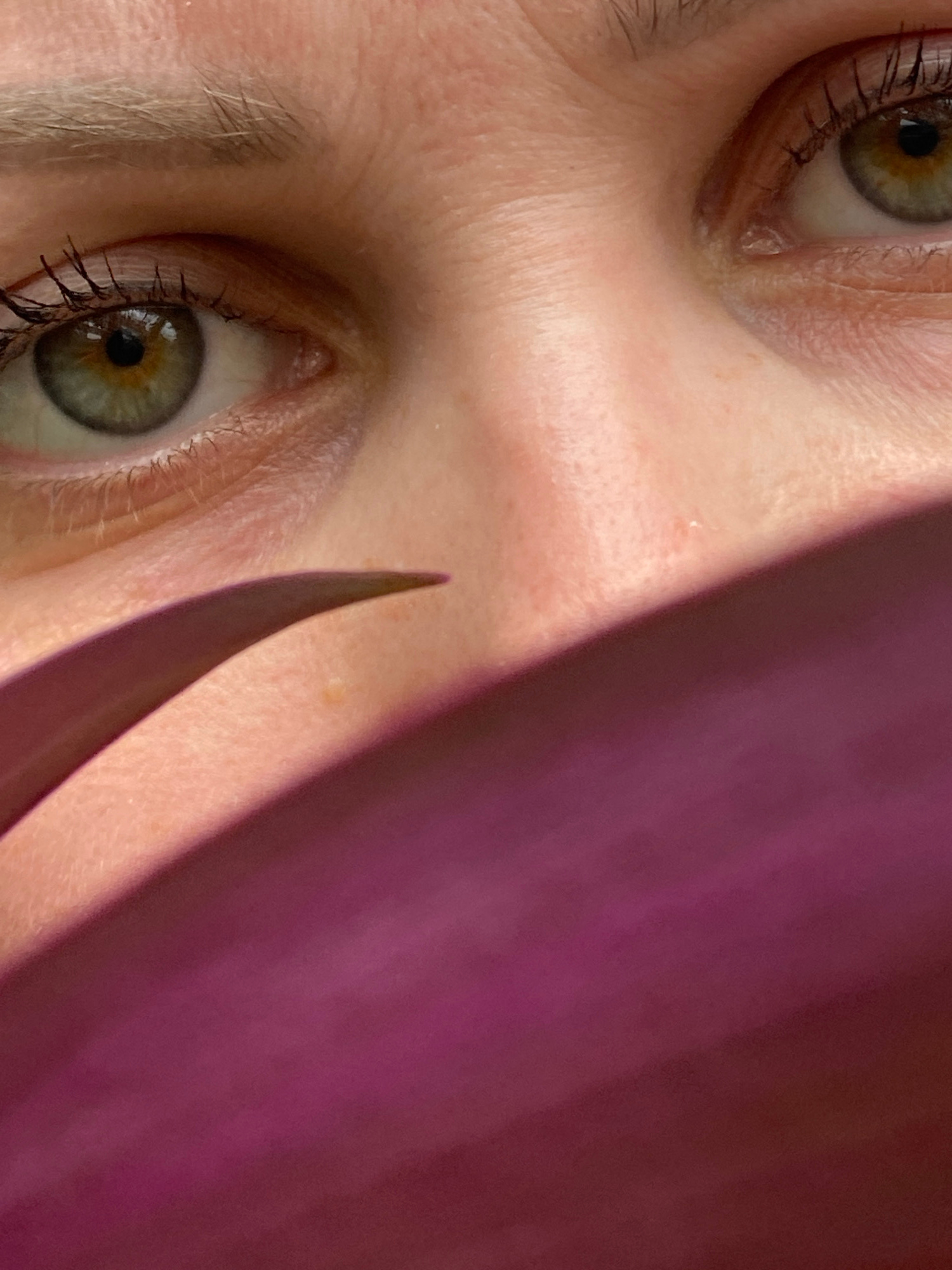 This close-up image shows a person's face rotated, with two eyes visible on the left side of the frame. The eyes are hazel-colored with dark eyelashes. The skin is light, showing fine wrinkles and a f…read more