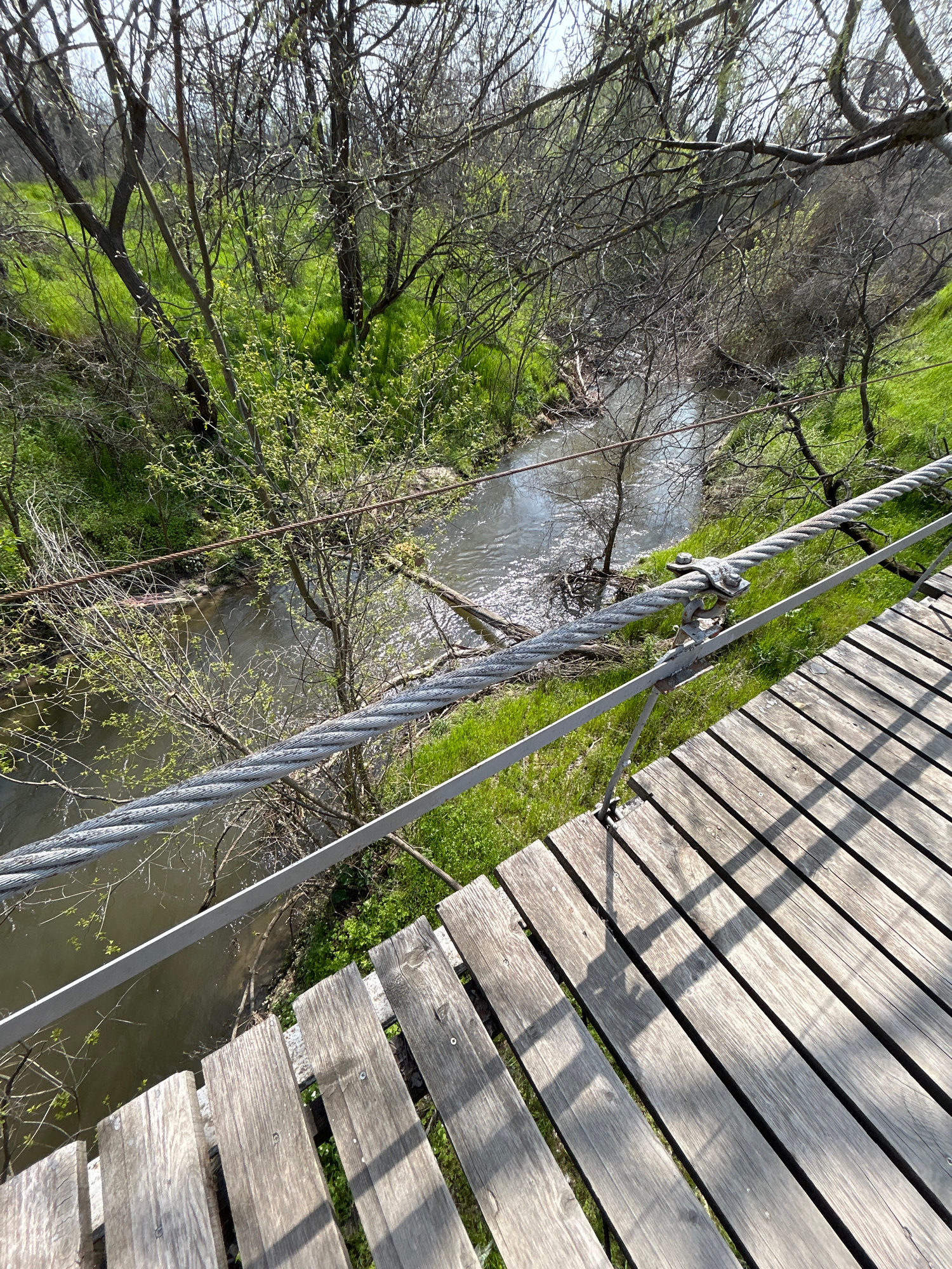 The image shows a section of a pedestrian suspension bridge over a stream. The bridge has wooden planks for the walkway, and thick steel cables support the bridge. The stream flows through a green are…read more