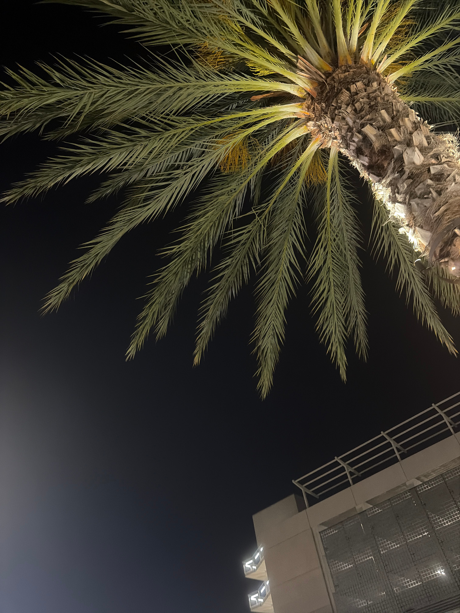 The image presents a low-angle view at night. Dominating the left side is the top portion of a palm tree, its fronds spreading outwards. The tree trunk is textured and illuminated. To the right, a porβ¦read more