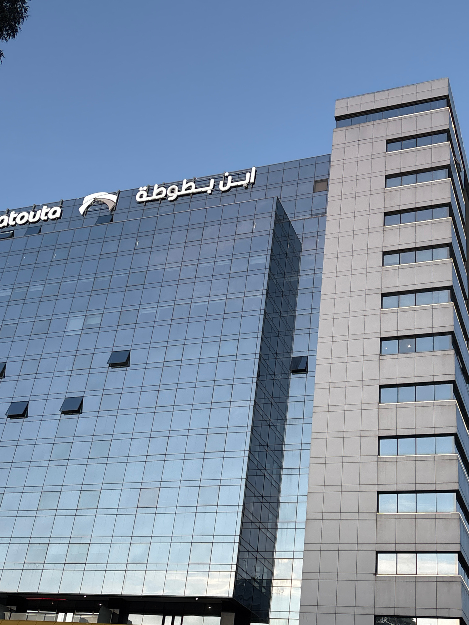 The image depicts a tall, modern building in Tanger (طنجة), Morocco. The building has a glass facade, with many windows reflecting the blue sky. A portion of the building has a gray exterior with blac…read more