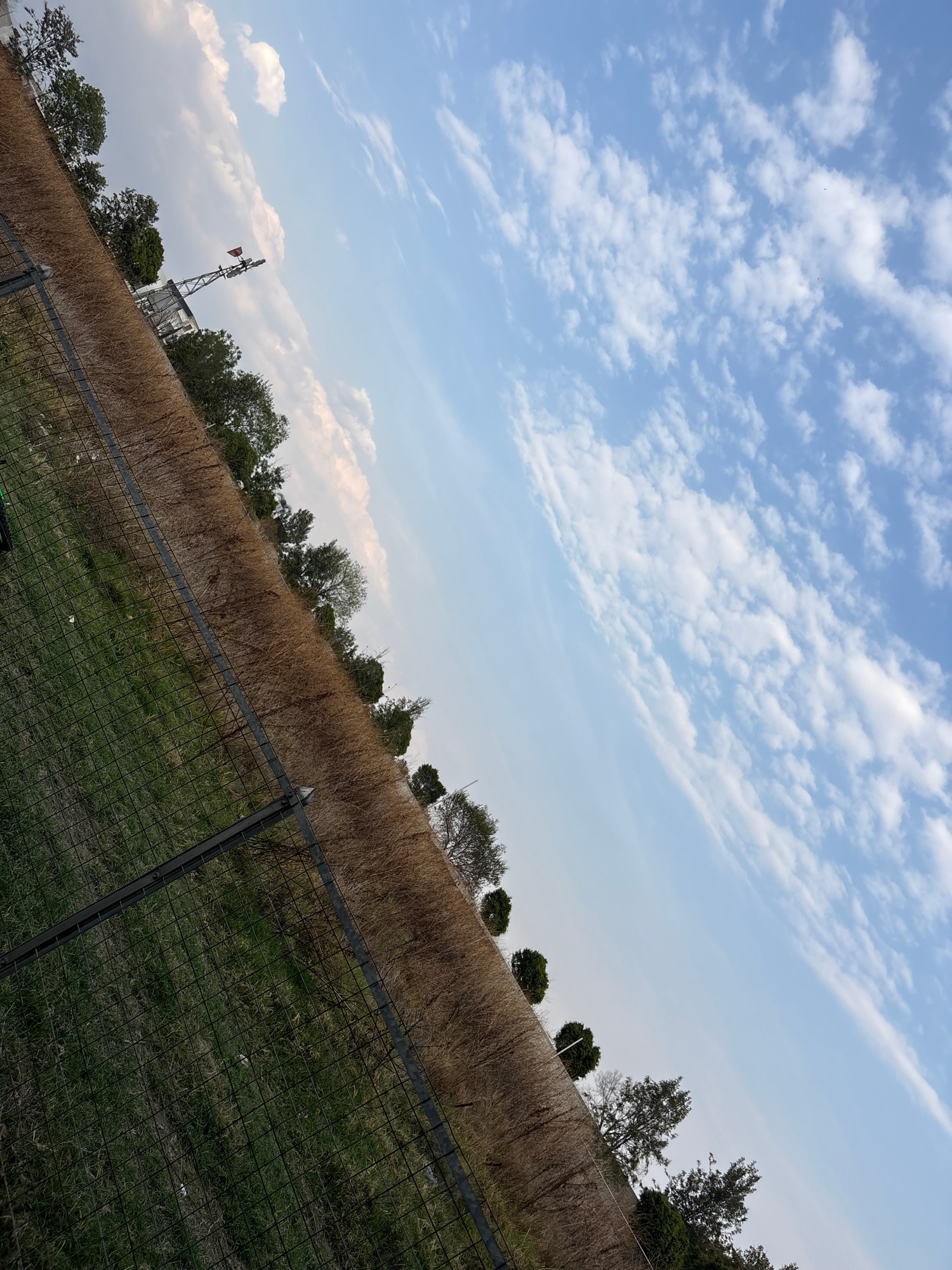 The image captures a rural scene in San Bernardino Tlaxcalancingo, Mexico. A chain-link fence stretches across the foreground, separating the viewer from a grassy area. Beyond the fence, a steep slope…read more