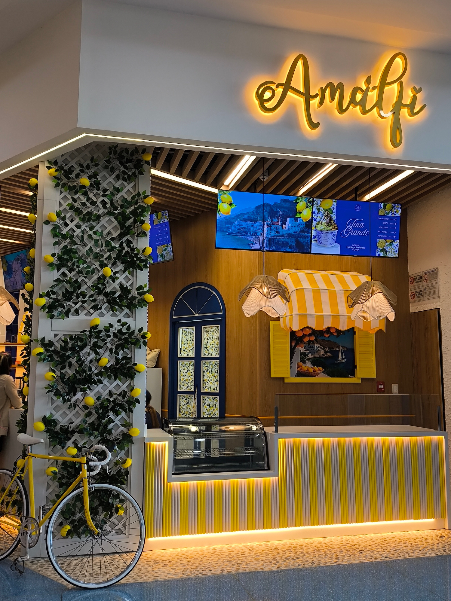 The image depicts the front of an ice cream shop called "Amalfi" in what is likely a shopping mall in Porlamar, Venezuela. The shop's design evokes a sunny, lemon-themed Italian coastal aesthetic. A t…read more