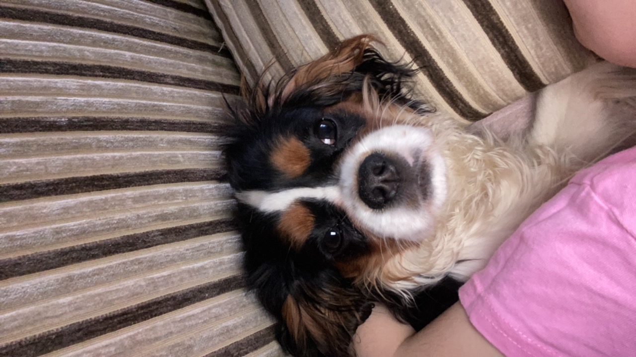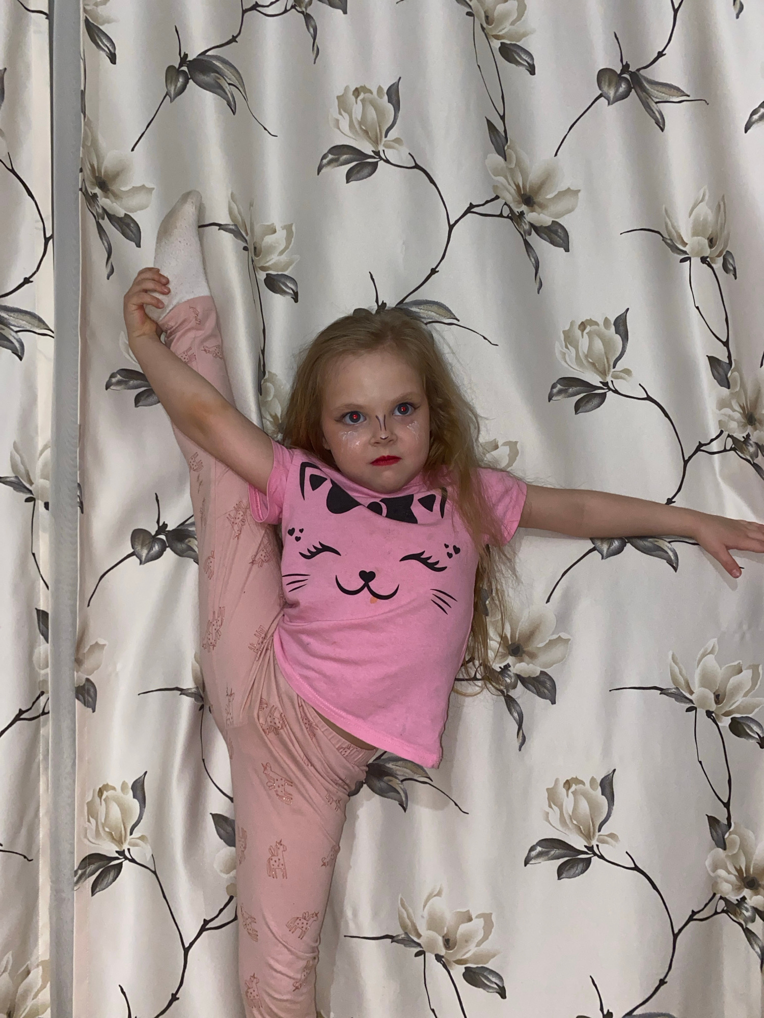 A young child lies on a bedspread patterned with cream-colored flowers and dark branches. The child is dressed in pink pajamas with a cartoon cat design on the shirt and giraffe patterns on the pants.…read more