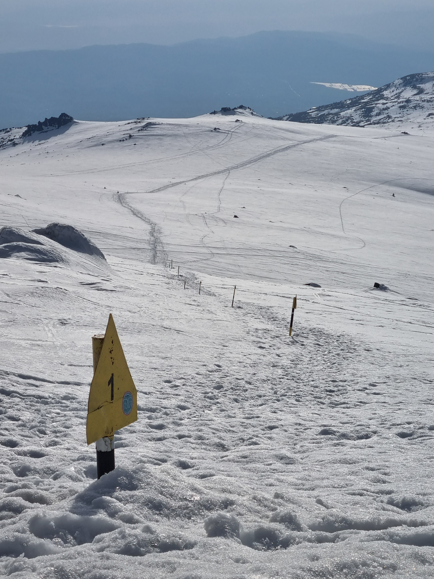 The image shows a snow-covered mountain landscape, possibly a glacier. The view is angled downwards, revealing a steep slope with a visible path of tracks in the snow. In the foreground, there is a ye…read more