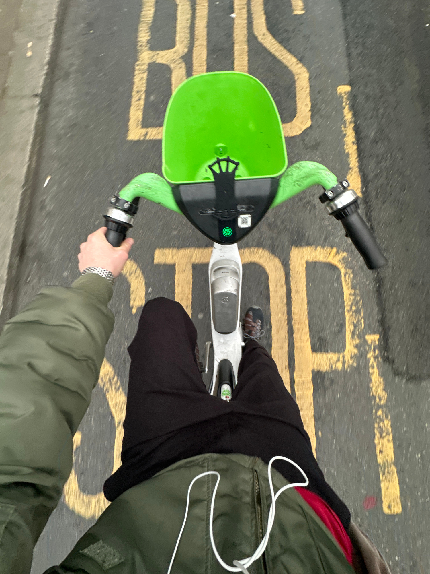 The image shows a person riding a Lime electric scooter on a street in London, United Kingdom. The scooter is positioned over yellow road markings that spell out "BUS." The rider is wearing a green ja…read more