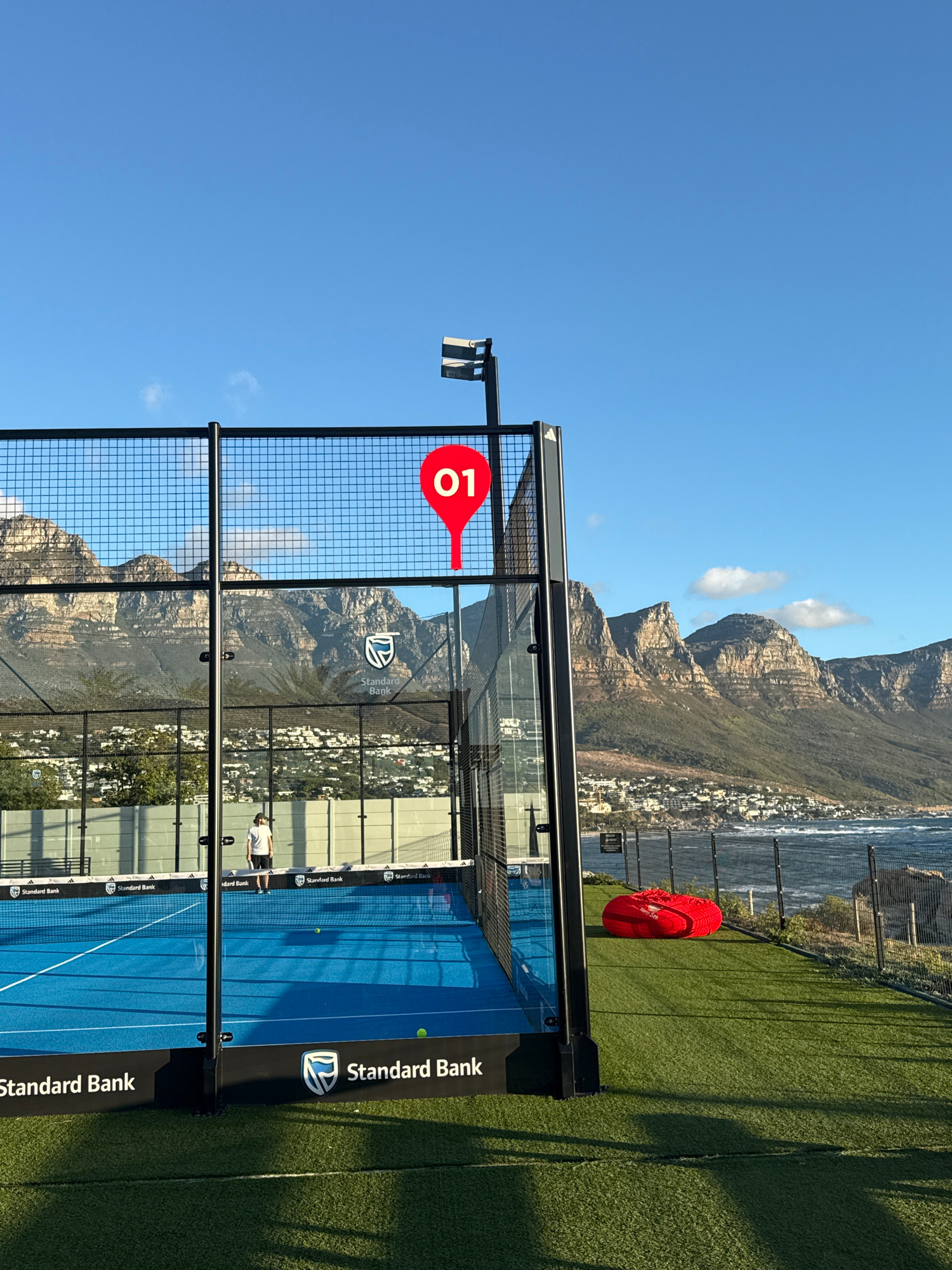Here is a concise description of the image: The image shows a paddle tennis court with a mountain range in the background. The court is blue with black framing and is adorned with the logo "Standard Bank." A man stands inside the court. A red ball sits in the background on a patch of green artificial turf. The sky is blue with a few clouds. The mountain range appears to be a part of the Table Mountain range near Cape Town, South Africa. | Open Wire