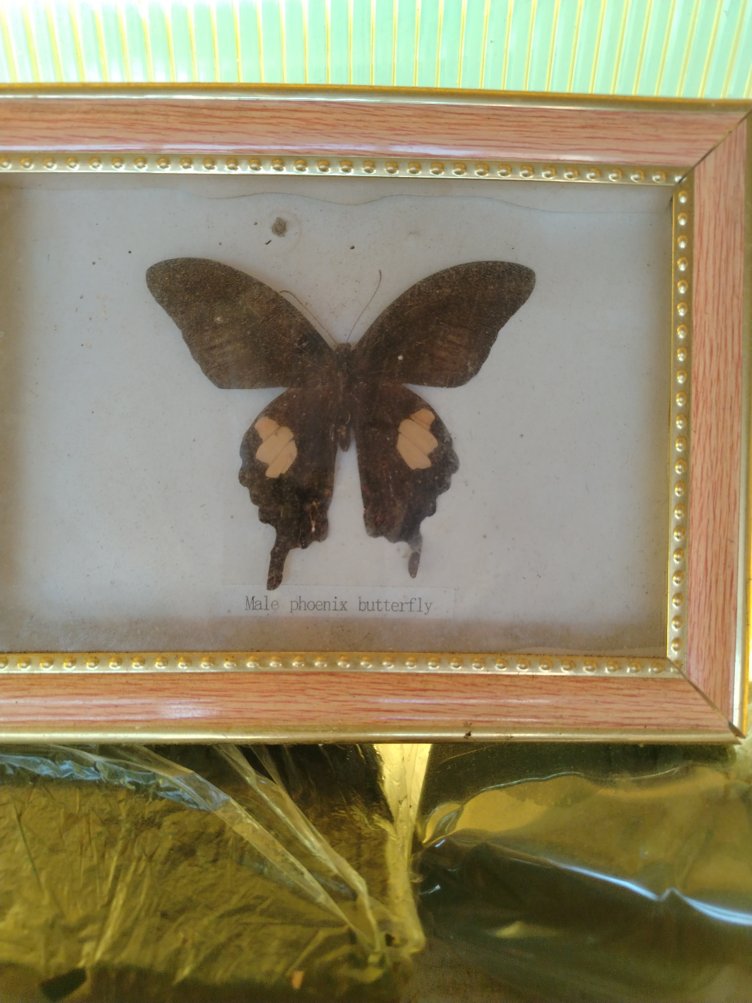 A framed "Male Phoenix butterfly" specimen is shown. The butterfly has dark brown wings with tan spots. The frame is light brown wood with gold accents. The frame sits on a wrinkled, gold-colored surfβ¦read more
