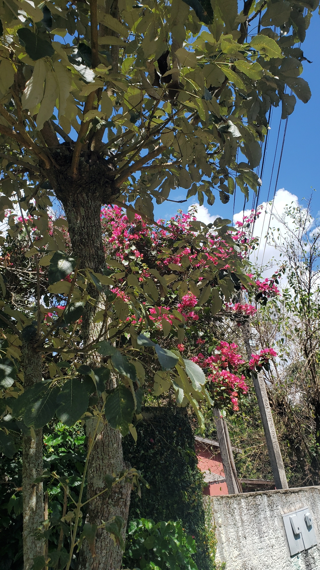 The photograph depicts a low-angle view of trees and foliage, against a backdrop of a partially obscured sky. The trees are a mix of green and pink, the latter likely bougainvillea flowers. A fence an…read more