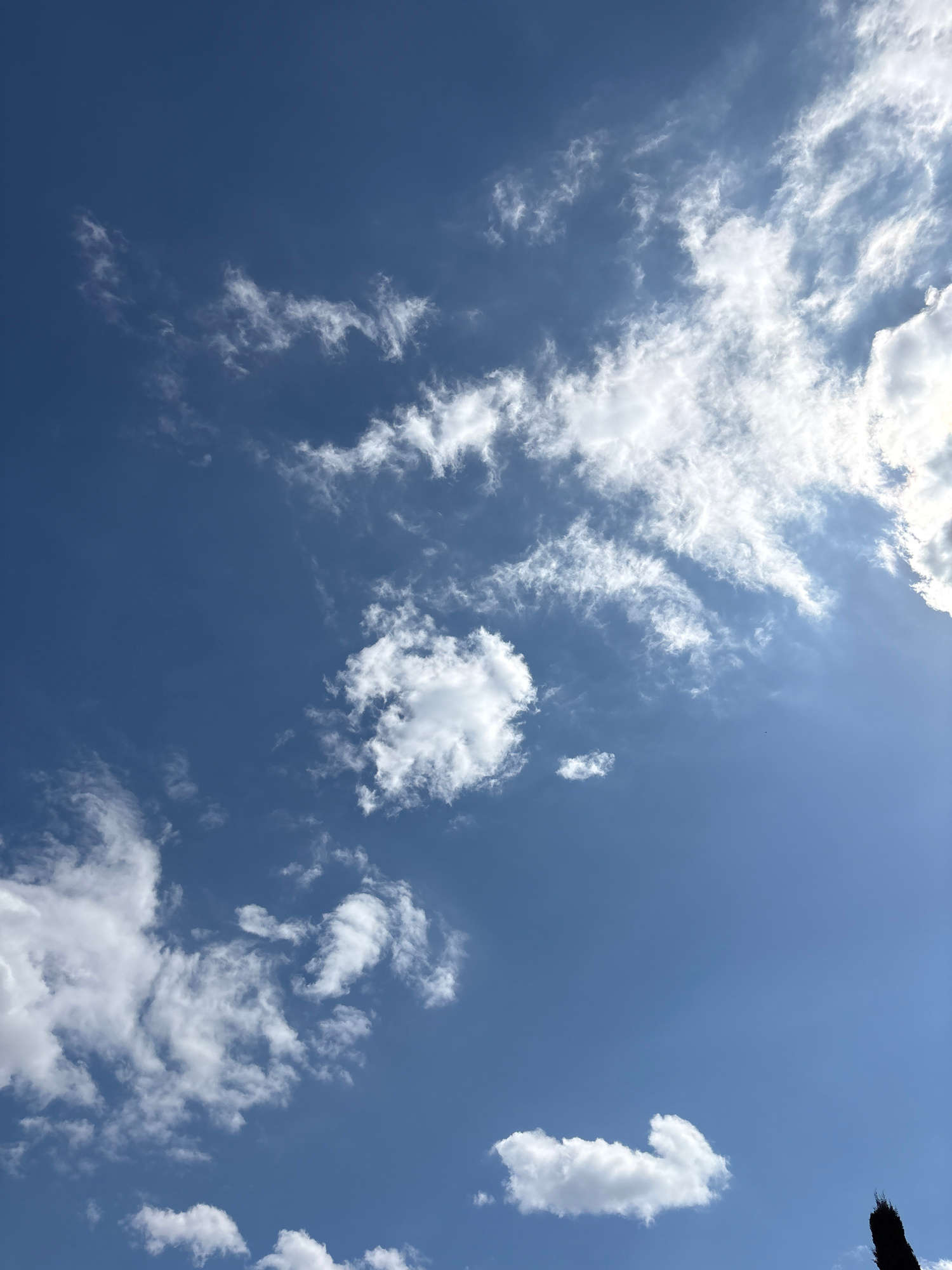 The image shows a view of the sky with varying types of clouds scattered across a blue background. Some clouds are wispy and stretched out, while others are more puffy and distinct. The location is Ka…read more