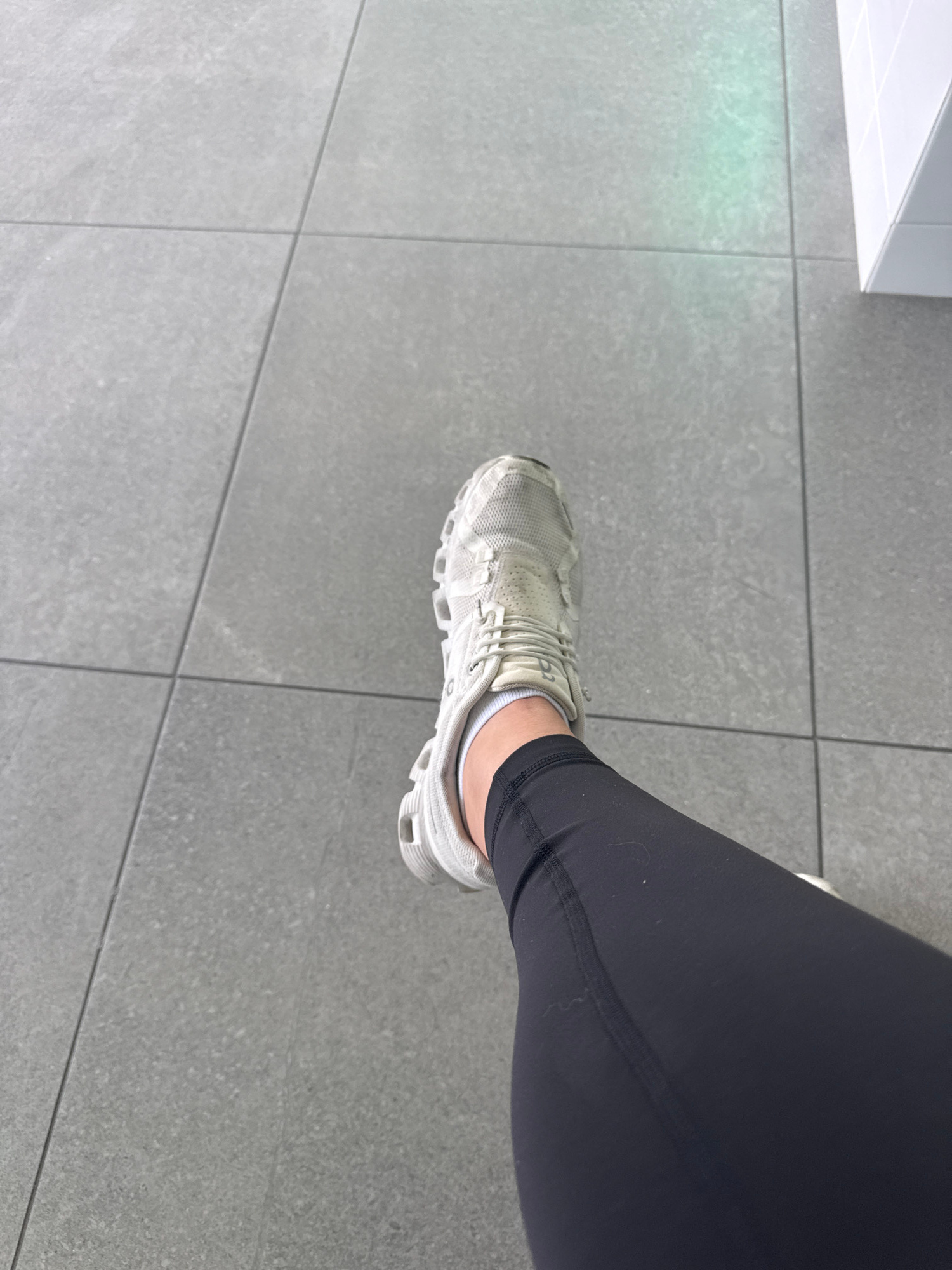 The image presents a close-up, high-angle view of a person's lower right leg and foot, positioned on a grey tiled floor. The person is wearing dark, likely black, athletic leggings that cover the leg…read more