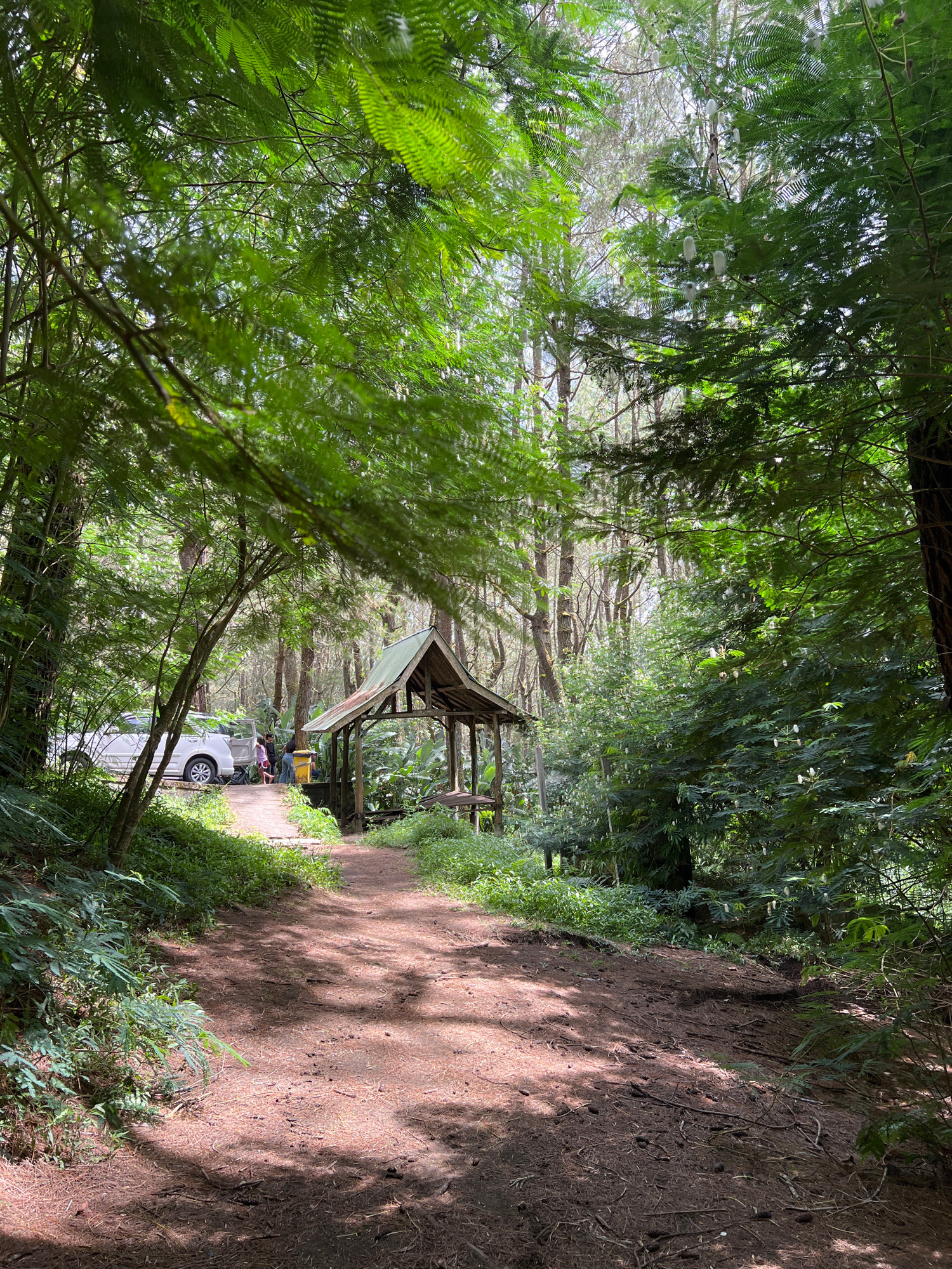 The image captures a forest path in Kintamani, Indonesia, leading to a small wooden pavilion. The path is covered with a layer of fallen pine needles and appears to be frequently traversed. Lush green…read more