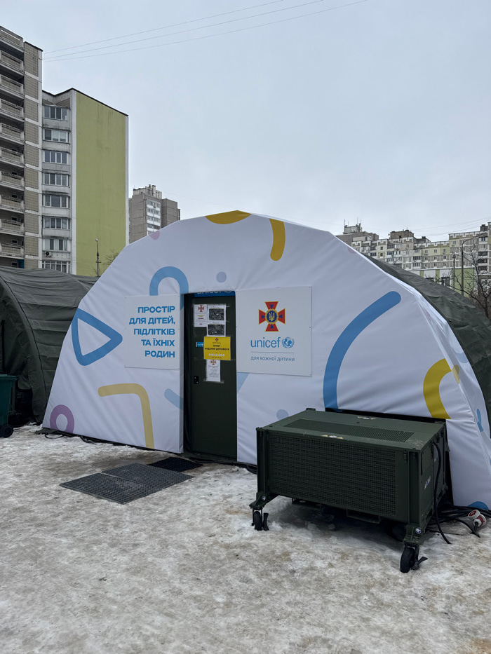 An outdoor scene in a residential area of Kyiv, Ukraine, features a humanitarian assistance point under an overcast sky. The primary subject is a large, white, arched tent with a pitched roof, decorat…read more