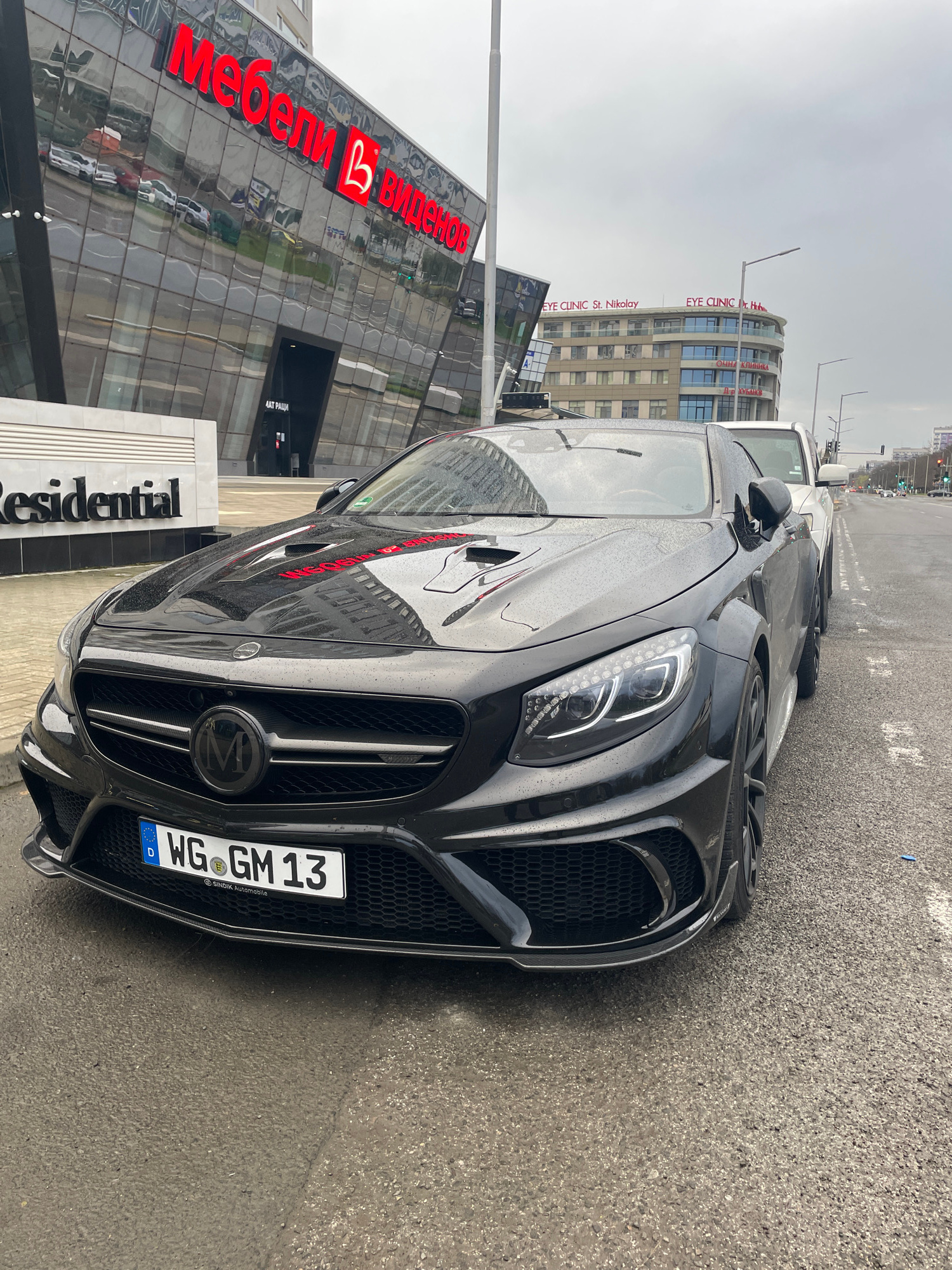 The image is a close-up shot of the front of a black sports car parked on a wet city street. The car features a custom grill and license plate that reads "WG GM 13," indicating it is registered in Ger…read more