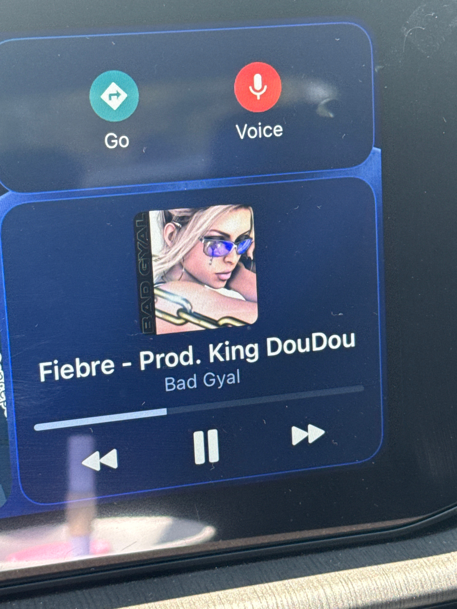 The image shows a smartphone screen displaying the Android Auto interface. Two main sections are visible: one for voice commands ("Voice") and navigation ("Go"), and another displaying music playback…read more