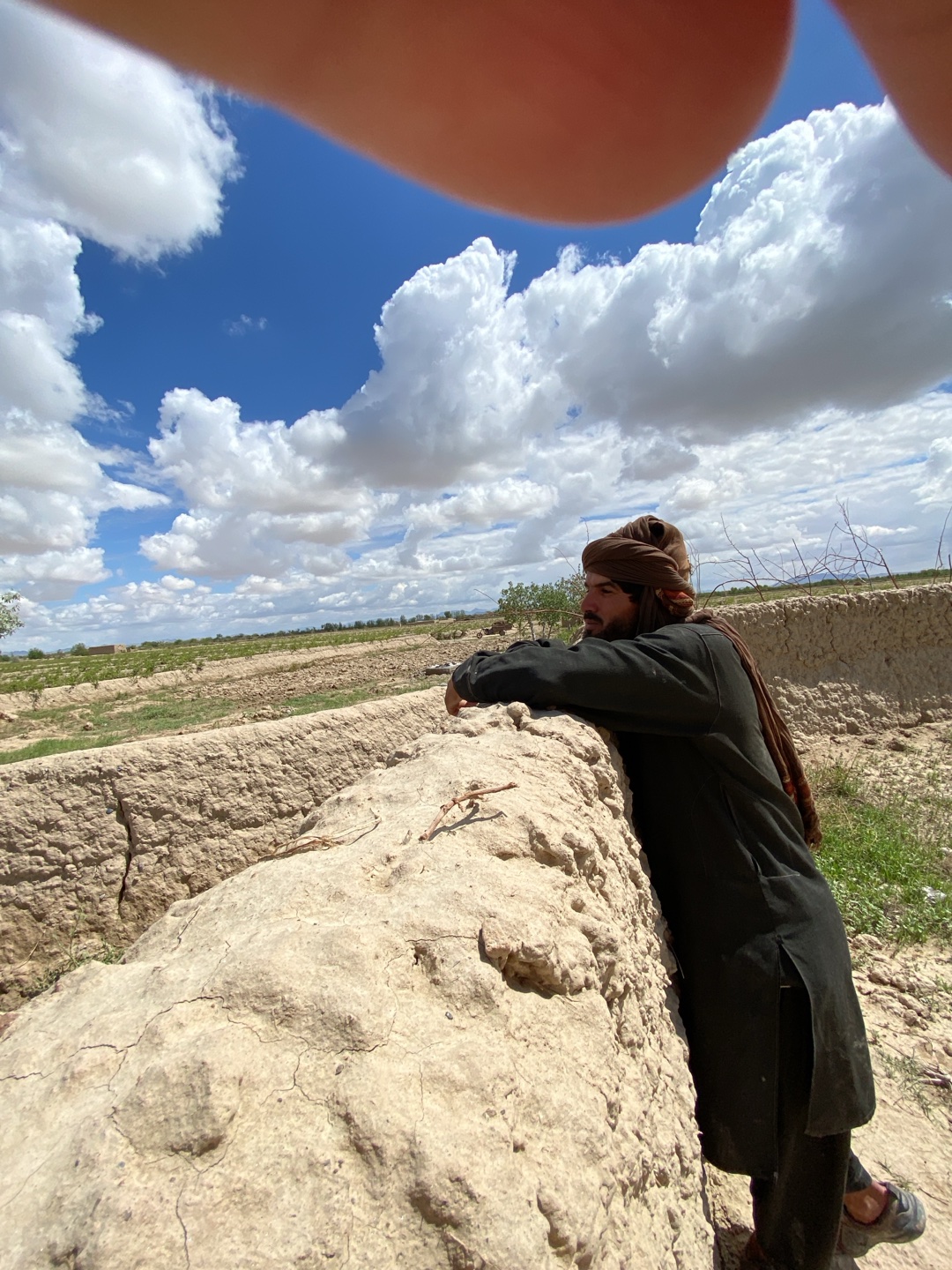 A man is standing by a low wall in an open, rural landscape. The man wears a dark-colored outfit, a turban, and sandals. He leans against the wall with his left arm. Behind the wall stretches a flat f…read more