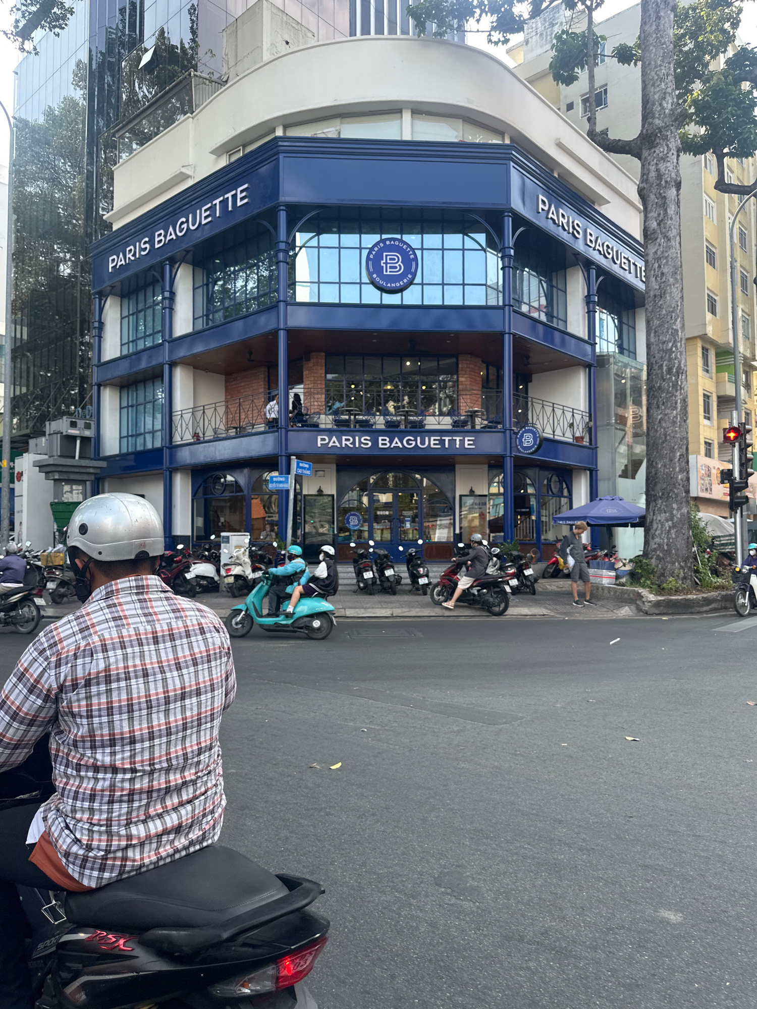 A three-story Paris Baguette bakery in Thủ Đức, Vietnam, is displayed prominently, featuring large windows and blue accents on the facade. Numerous parked motorbikes are positioned around the building…read more