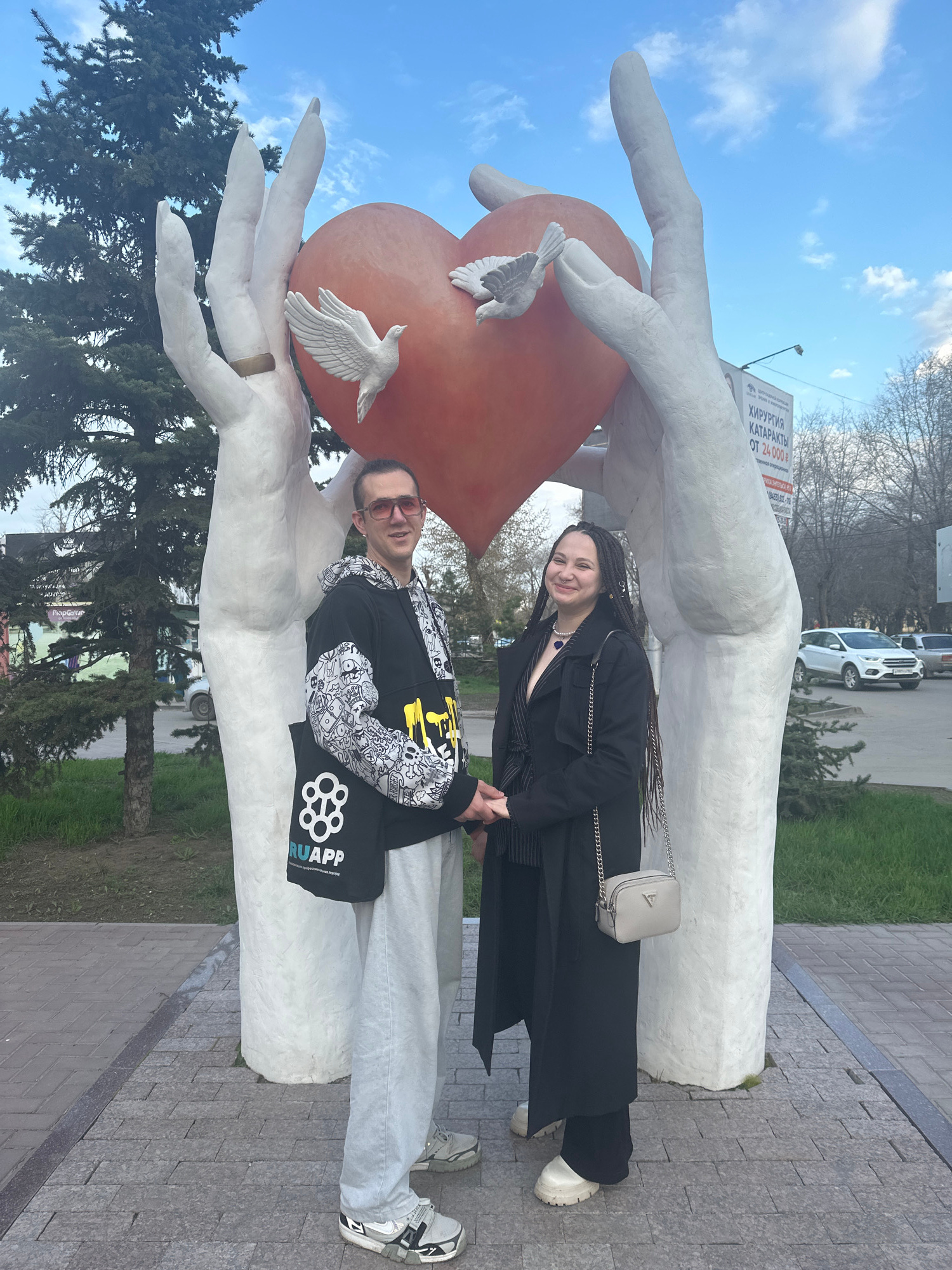 A couple is photographed in front of a large, abstract sculpture of two hands holding a red heart with white doves. The woman has long braids and wears a black coat and light-colored handbag. The man…read more