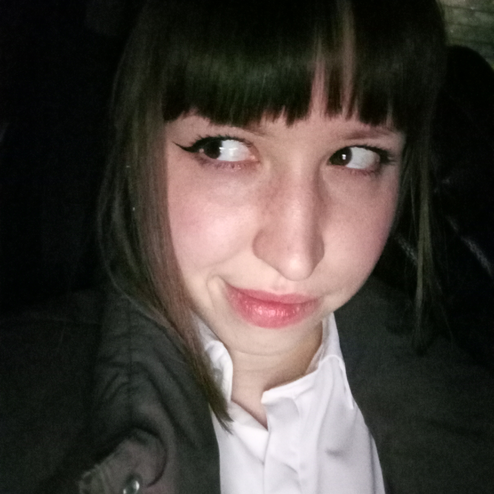 A woman with dark hair and bangs is looking to the side with a slight smirk. She has fair skin with freckles, and her eyes are lined with eyeliner. She is wearing a white collared shirt and a dark bla…read more