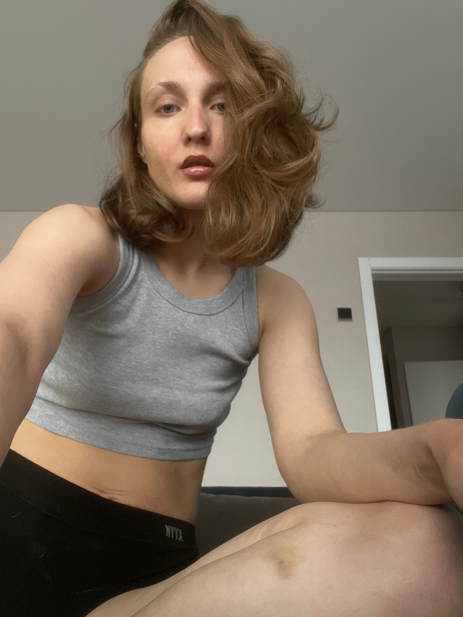 A woman is sitting indoors. She has shoulder-length wavy brown hair, light skin, and is wearing a gray tank top and black bottoms with the word "MYNX" printed on the waistband. There is a visible brui…read more