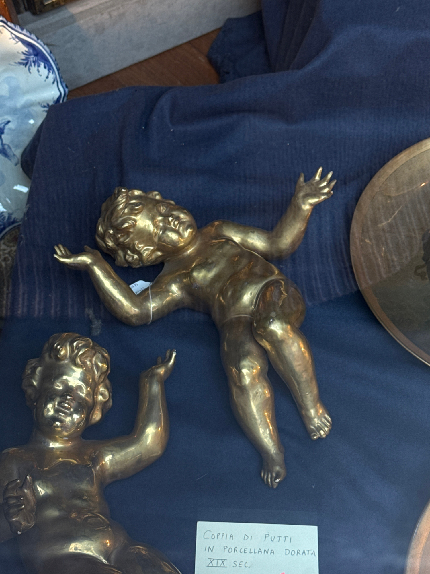 The image captures two golden-colored putti figures, likely antique or decorative items, displayed on a dark blue fabric. One putto, positioned prominently in the center, lies on its back with arms anβ¦read more