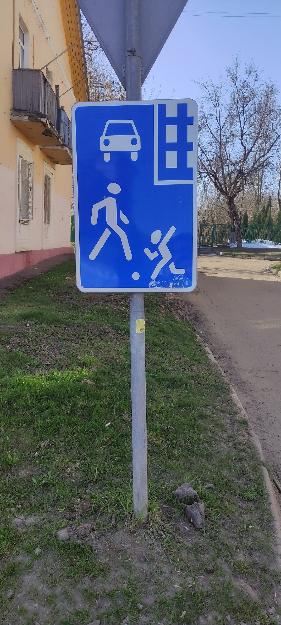 The image depicts a blue and white street sign in Fryazino, Russia. The sign indicates a residential area with children playing. It is mounted on a gray metal pole, rooted in a grassy area beside a si…read more