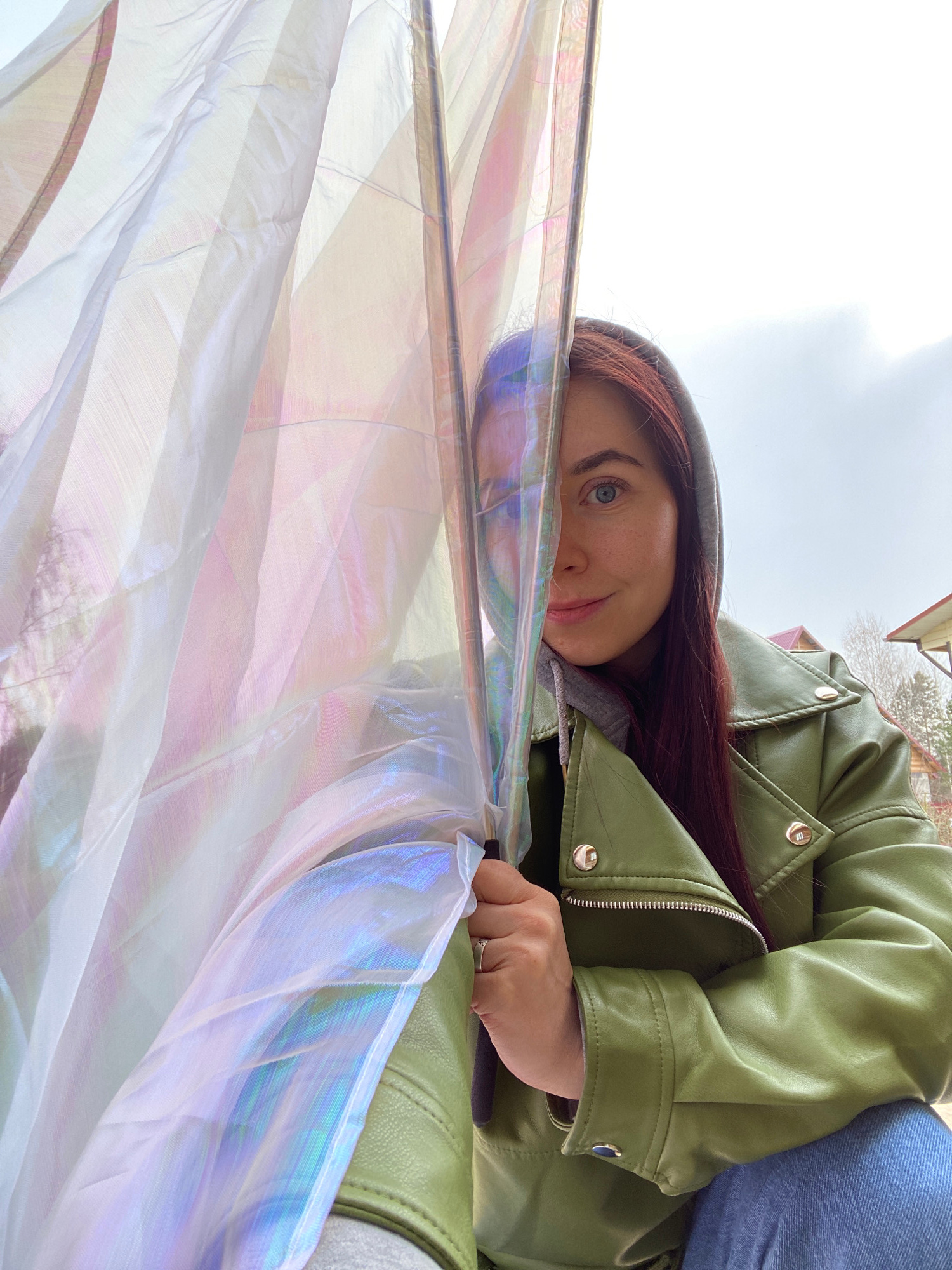 The image captures a close-up, low-angle perspective of a young woman lying down or leaning back, looking directly at the viewer with a gentle, inviting smile. She has long, dark reddish-brown hair, b…read more