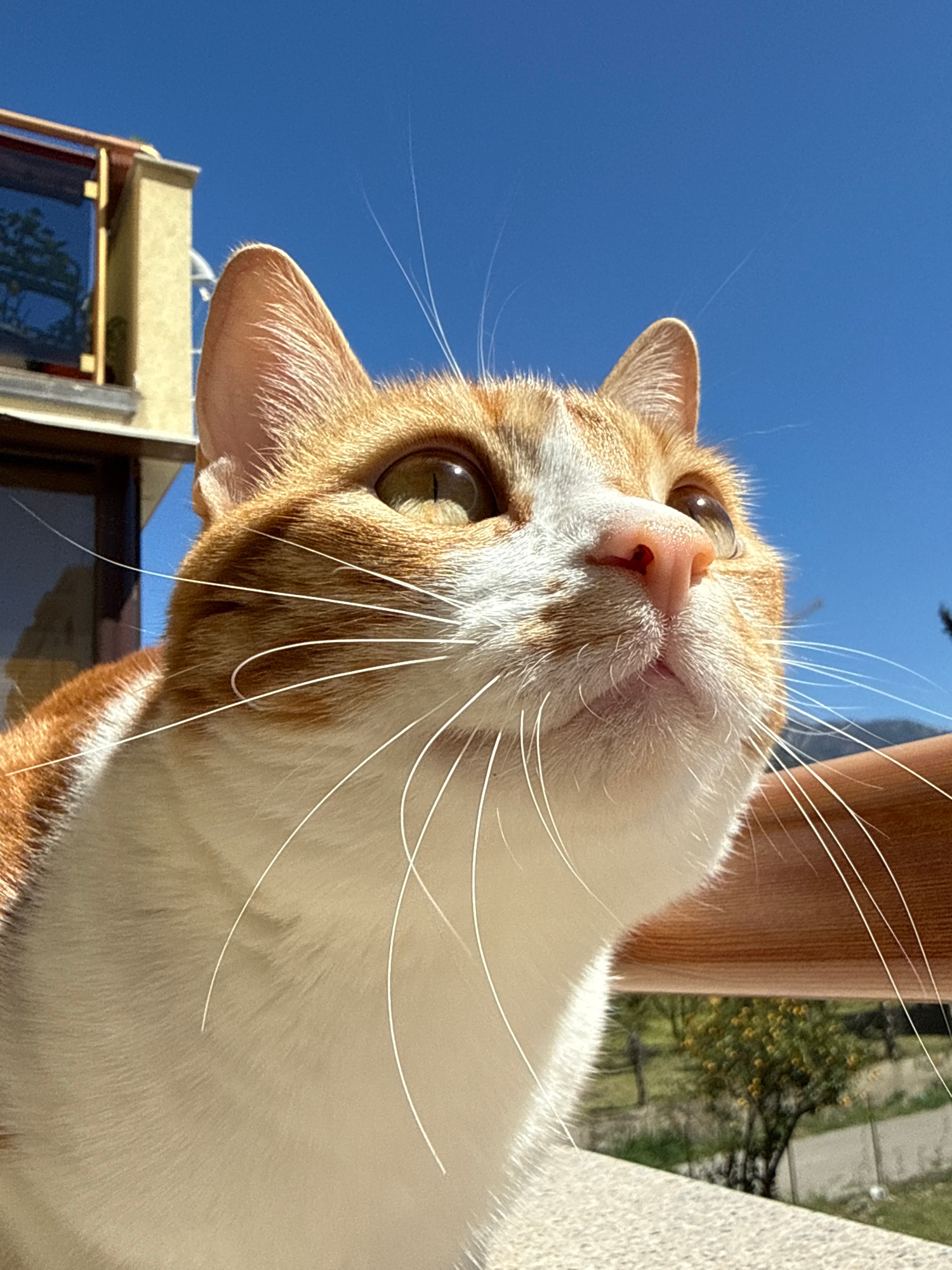 A close-up, low-angle shot features an orange and white cat, positioned against a clear blue sky. The cat's head is tilted, displaying its pink nose, amber eyes, and numerous white whiskers. Behind th…read more