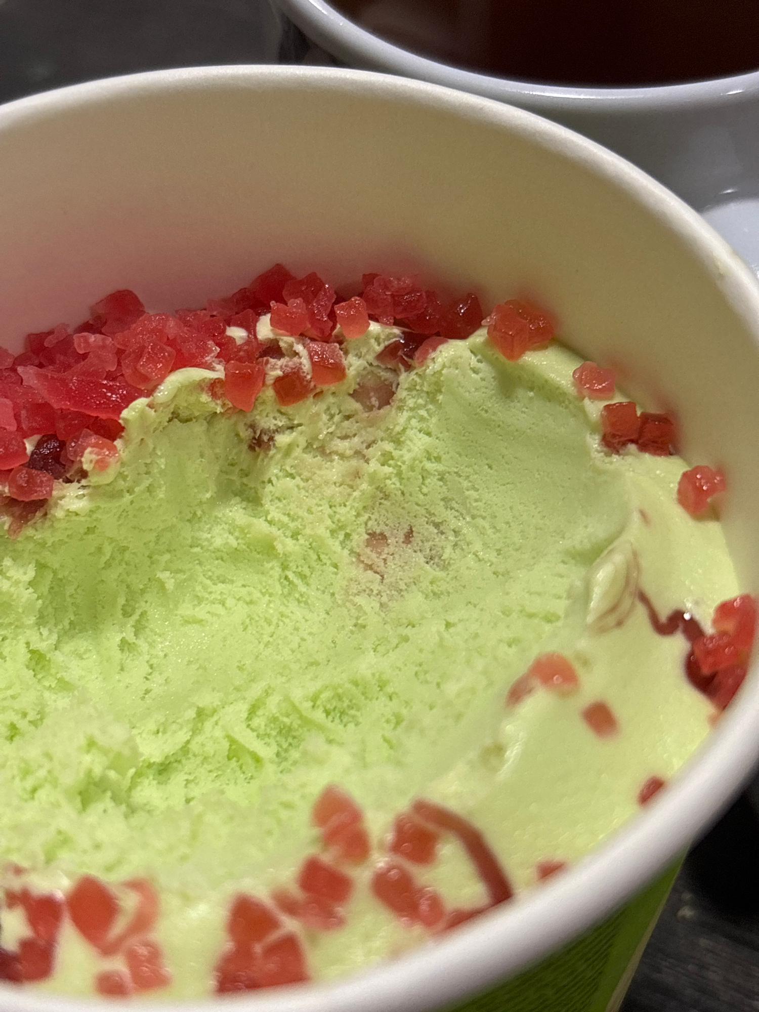 A close-up shot depicts a white paper cup filled with pale green ice cream, topped with small red cubes. Part of another white cup containing a dark liquid is visible to the left of the ice cream. Bas…read more