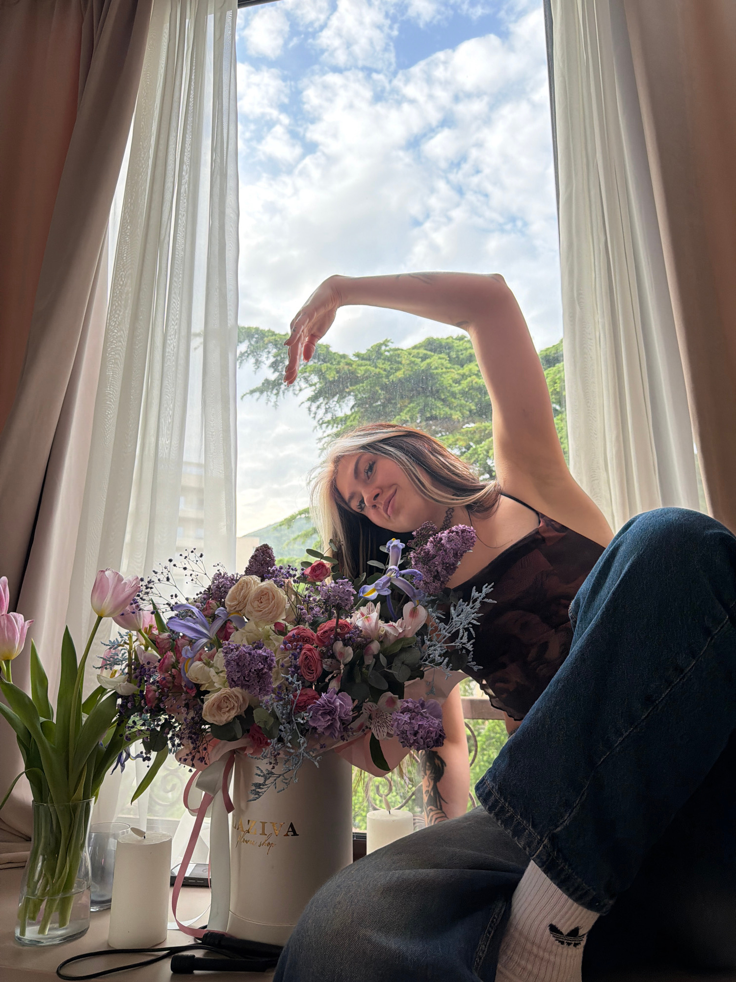 The image captures a young woman posing indoors by a large window with a view of a bright, cloudy sky and lush green trees, characteristic of a scenic location like Budva, Montenegro. The photograph i…read more