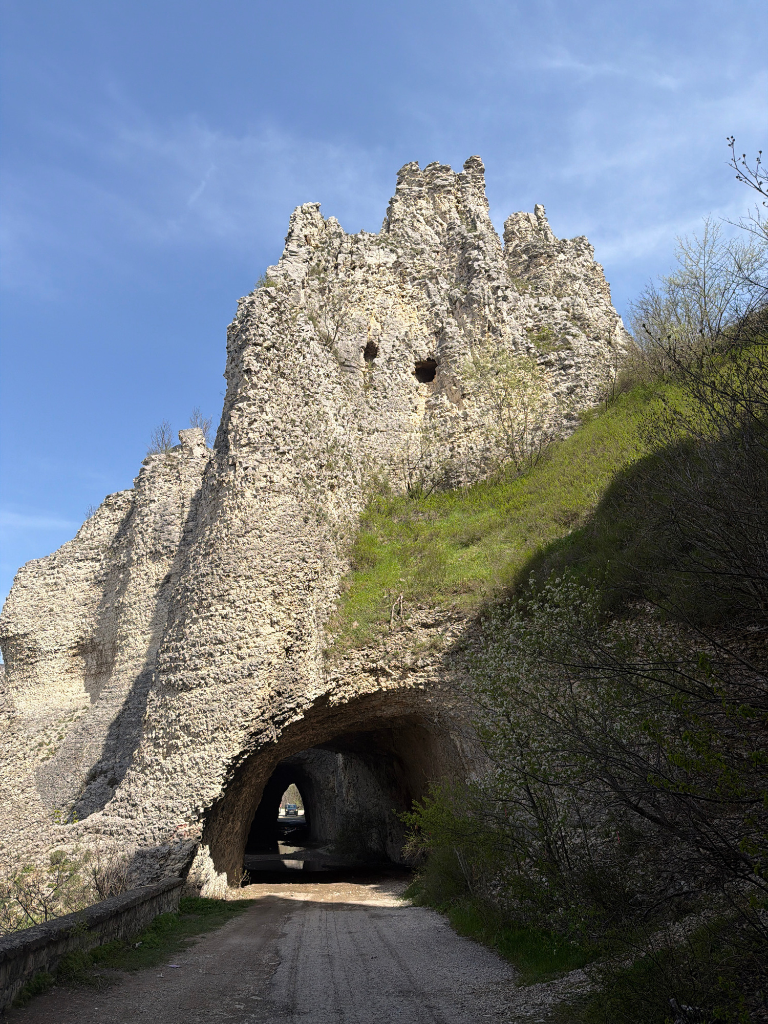 The image shows a rock formation with a tunnel carved through it, located in the city of Asparuhovo, Bulgaria. The rock is light-colored and textured, with some holes and protrusions. Grass and vegeta…read more