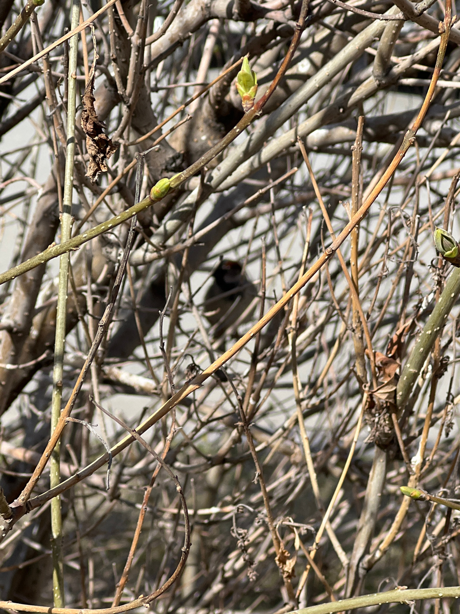 The image depicts a dense thicket of interwoven branches and twigs. Some of the branches show emerging buds, suggesting the beginning of spring. The twigs range in color from brown to gray. A diffuse…read more