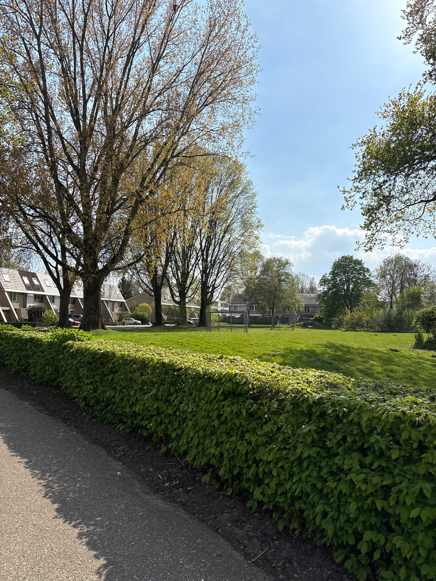 The image presents a scene from Veghel, Netherlands. A row of mature trees with budding leaves lines a street, interspersed with buildings. Adjacent to the trees is a tall, dense green hedge. A paved…read more