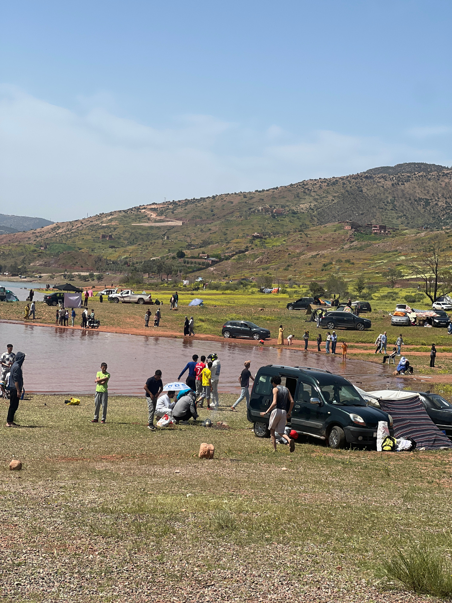 The image depicts a scene in Bin El Ouidane, Morocco, showing a large, open area possibly near a lake or river. The ground is a mix of dirt and grass, appearing wet or flooded in certain areas. Severa…read more