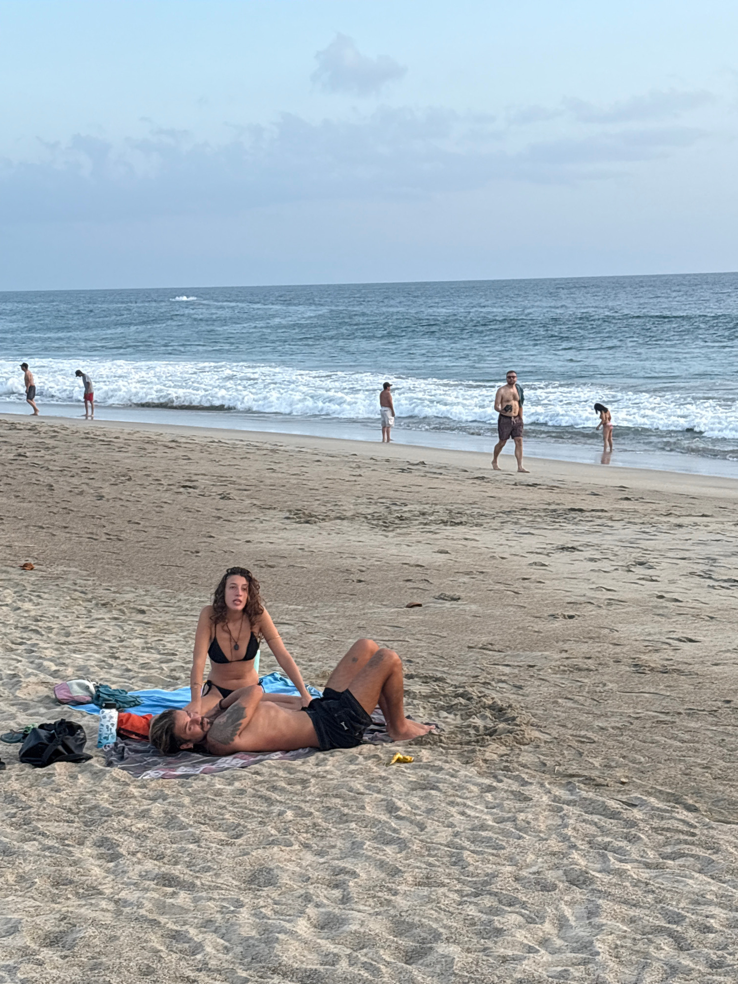 The image shows a beach in Brisas de Zicatela, Mexico. In the foreground, a couple is lying on a beach towel on the sand. The woman is wearing a black bikini, and the man is wearing black shorts. The…read more