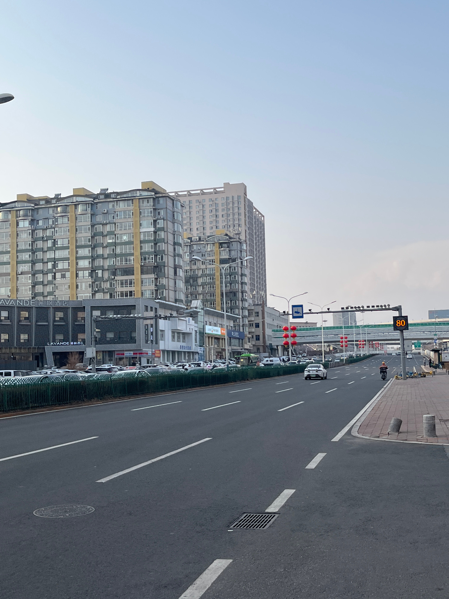 The image captures a vibrant urban street scene in Changchun City, China, during what appears to be a clear daytime. The perspective looks down a wide, multi-lane asphalt road lined with tall building…read more