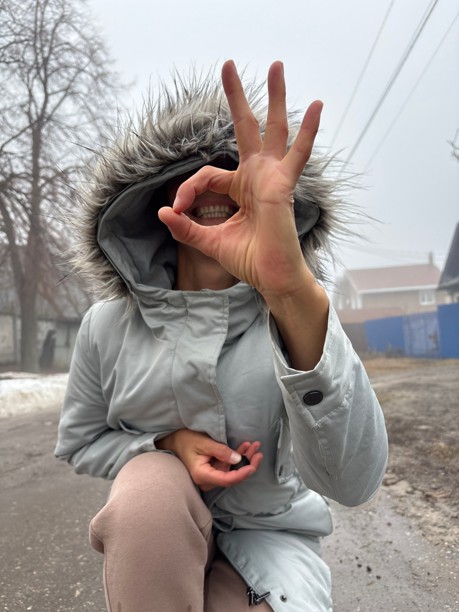 The image shows a person wearing a light grey, hooded jacket with a fur trim on the hood, standing outside on a cloudy day in Ulyanovsk, Russia. The person is holding up their left hand, making a circ…read more