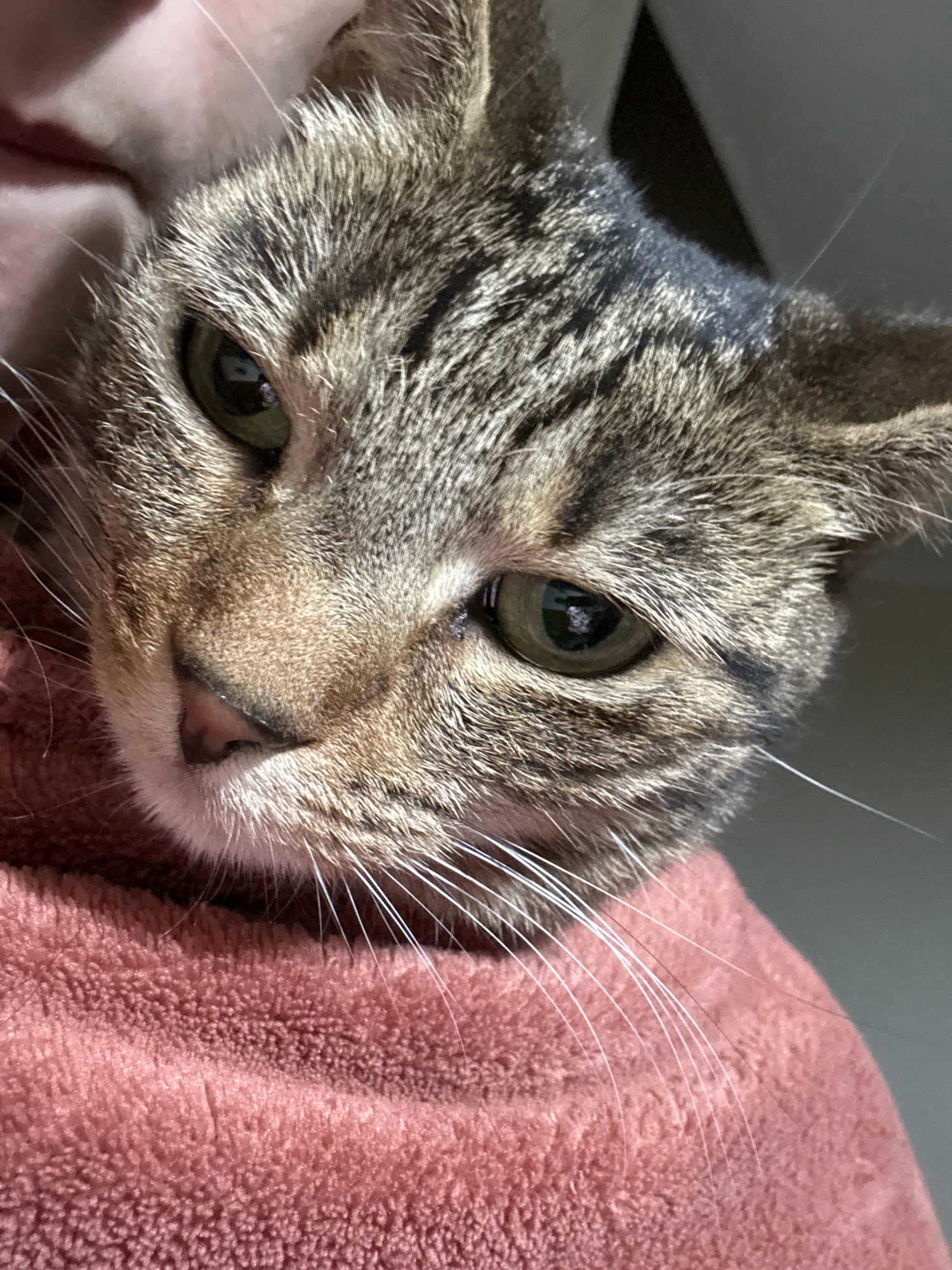 A close-up shot features a tabby cat's head and upper body resting against a pink, textured blanket or fabric. The cat has green eyes, a small pink nose, and long white whiskers. Its fur exhibits a mi…read more