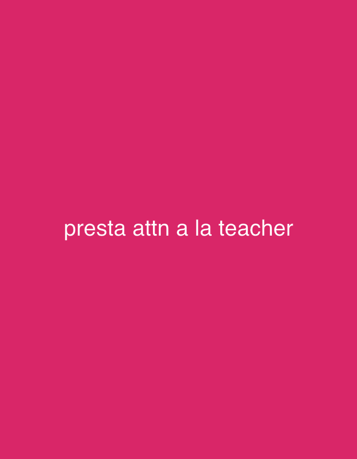 A solid pink background with the white text "presta attn a la teacher" in the center.