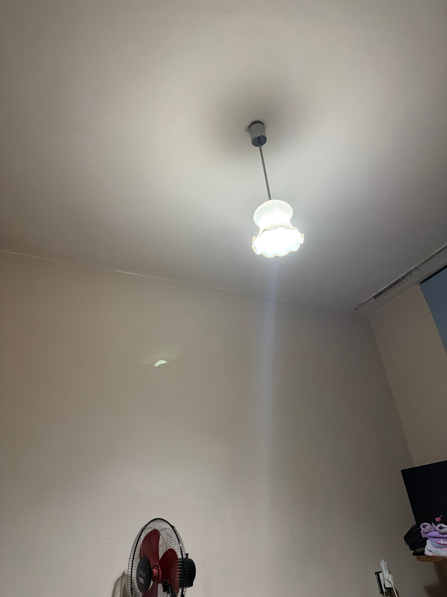The image shows the corner of a room with light beige walls. In the upper left corner, a ceiling-mounted light fixture with a white, frilly shade is visible. A ceiling fan with red blades is mounted o…read more