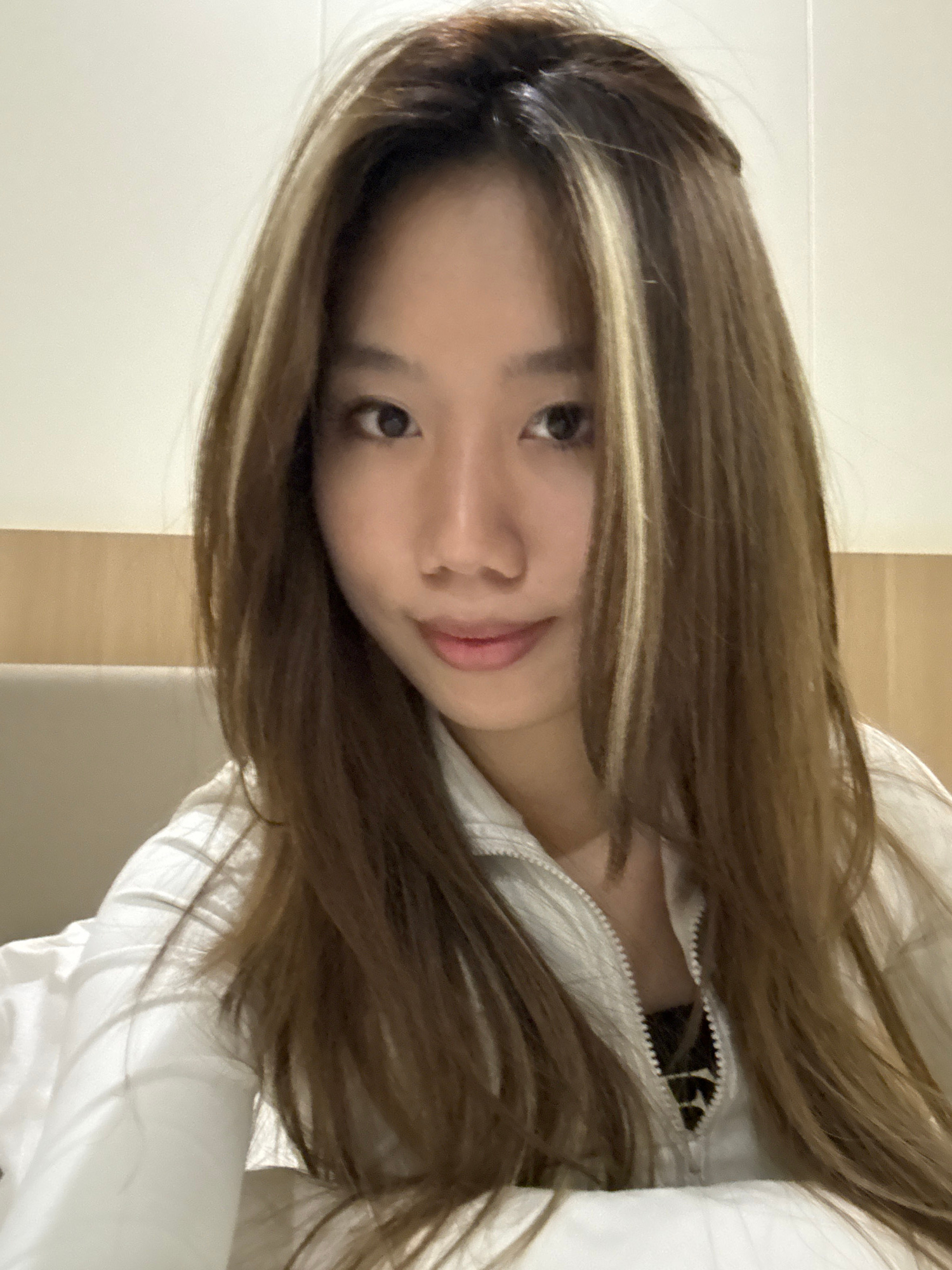 The image depicts a young Asian woman with brown hair and blonde highlights. She is wearing a white jacket. The background is a light beige wall. There is no information in the image to indicate it wa…read more