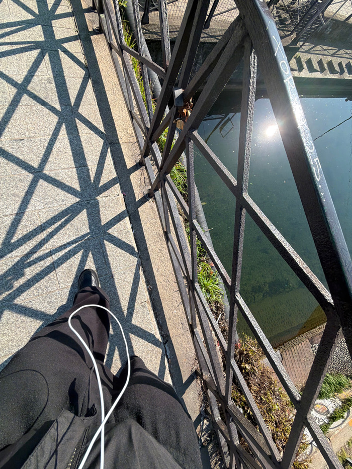 The image presents a downward, first-person perspective of an outdoor scene, identifiable as a canal-side walkway in the Navigli district of Milan, Italy. In the lower-left foreground, the lower body…read more