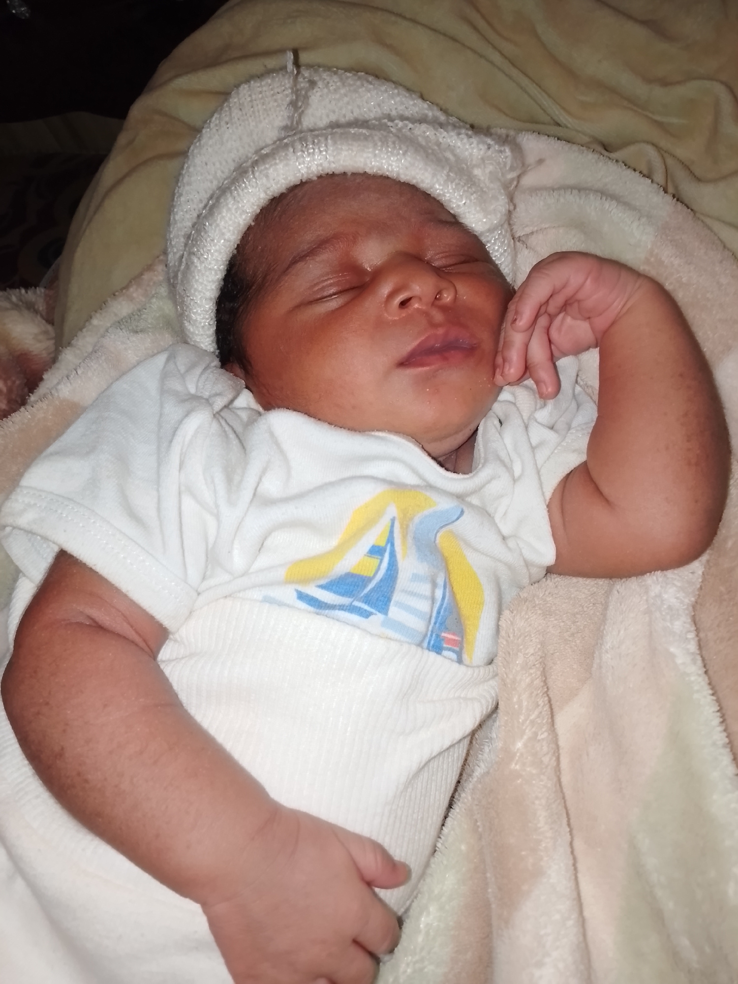 A close-up shot shows a sleeping newborn wearing a white knit hat and a white onesie with a sailboat design. The baby is lying on a soft, light-beige blanket. The location is unknown.