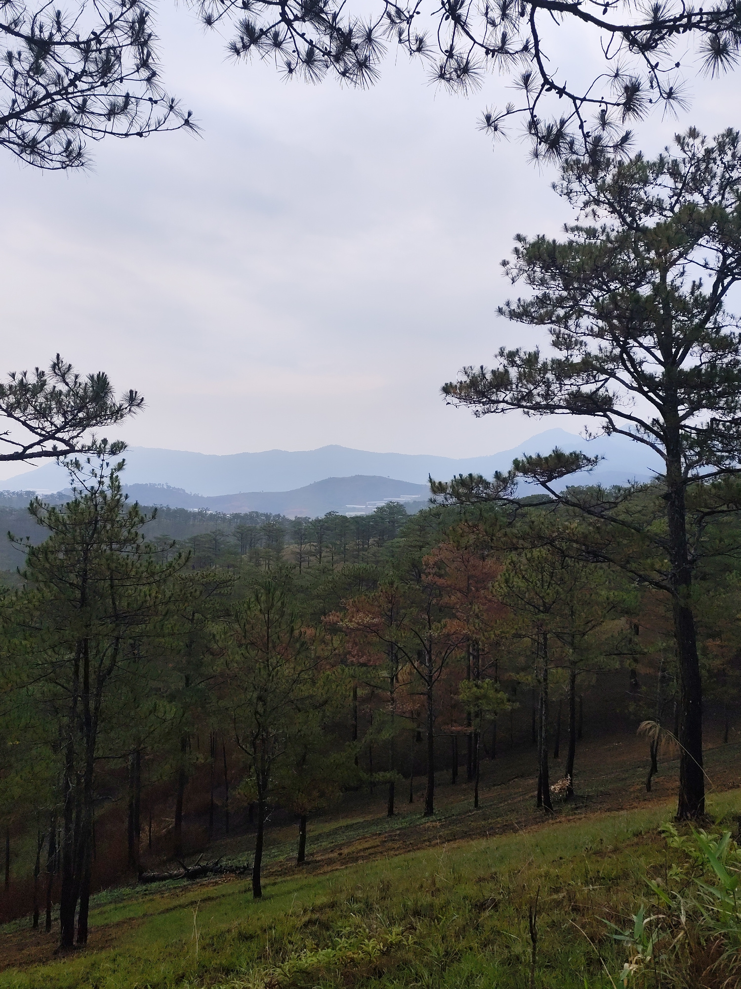 A daytime medium shot depicts a forest scene in Lam Vien - Da Lat, Vietnam, observed from an elevated vantage point. Foreground: a grassy slope. Midground: a dense forest of primarily coniferous trees…read more