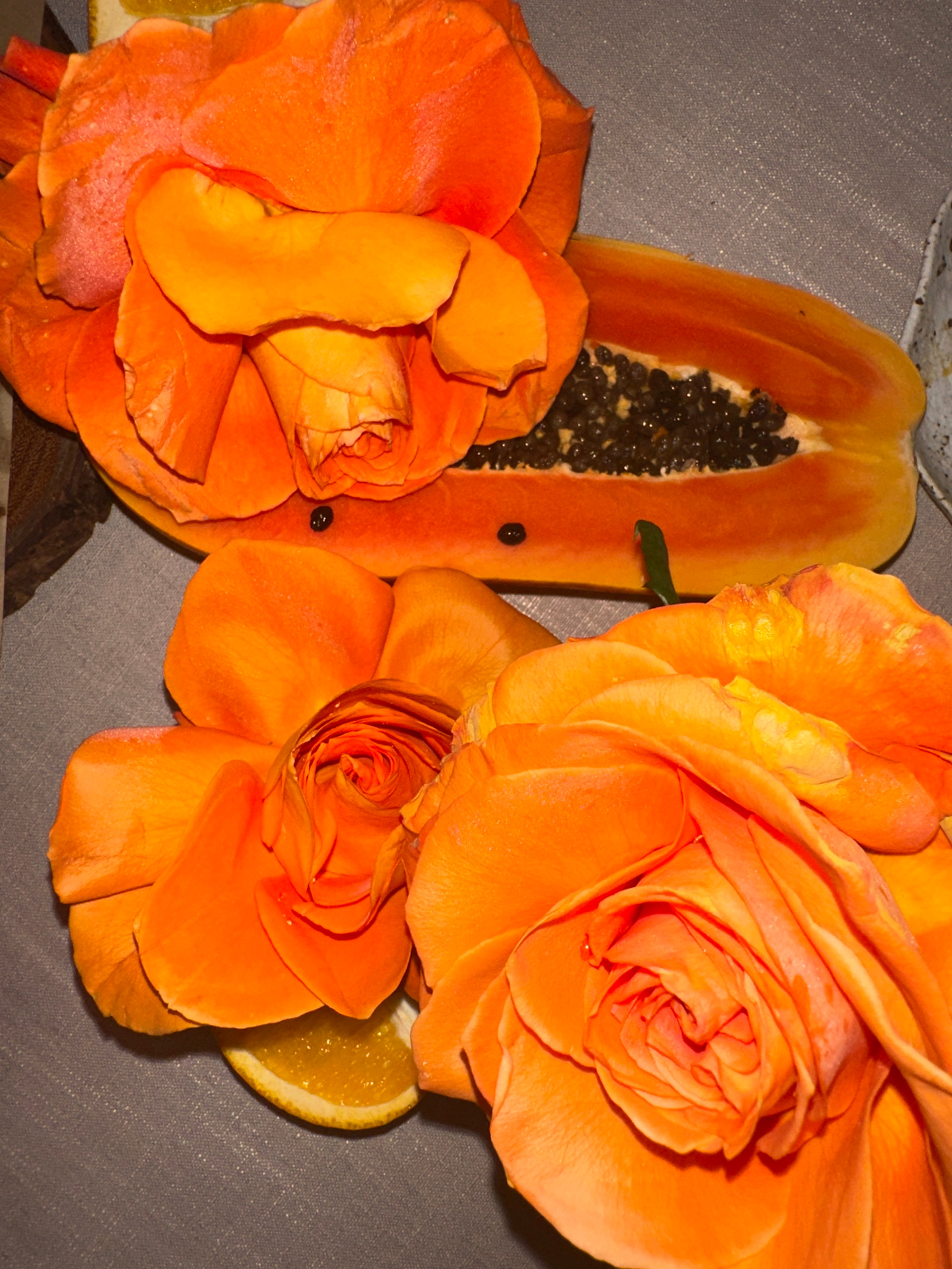 The image, reportedly from Si Sunthon, Thailand, displays a static, close-up, overhead view of a composition arranged on a dark gray, woven fabric surface. Two large, vibrant orange floral specimens,…read more