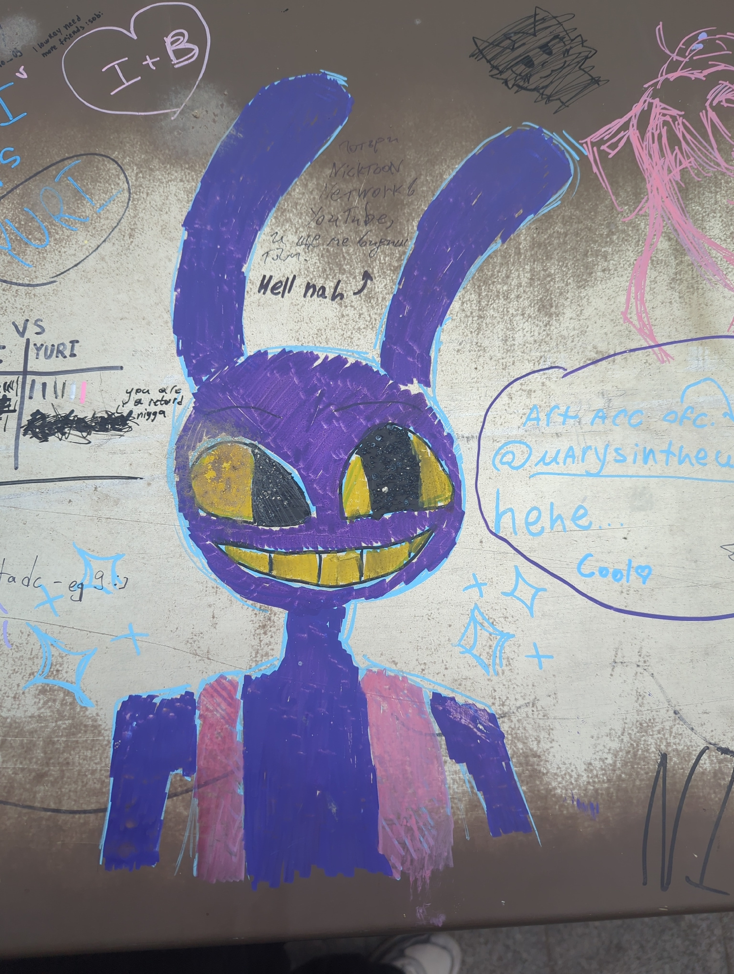 The image shows a section of a brown picnic table covered in graffiti. Predominantly, there is a large, crudely drawn purple cartoon character with long ears, a wide yellow-toothed grin, and black eye…read more