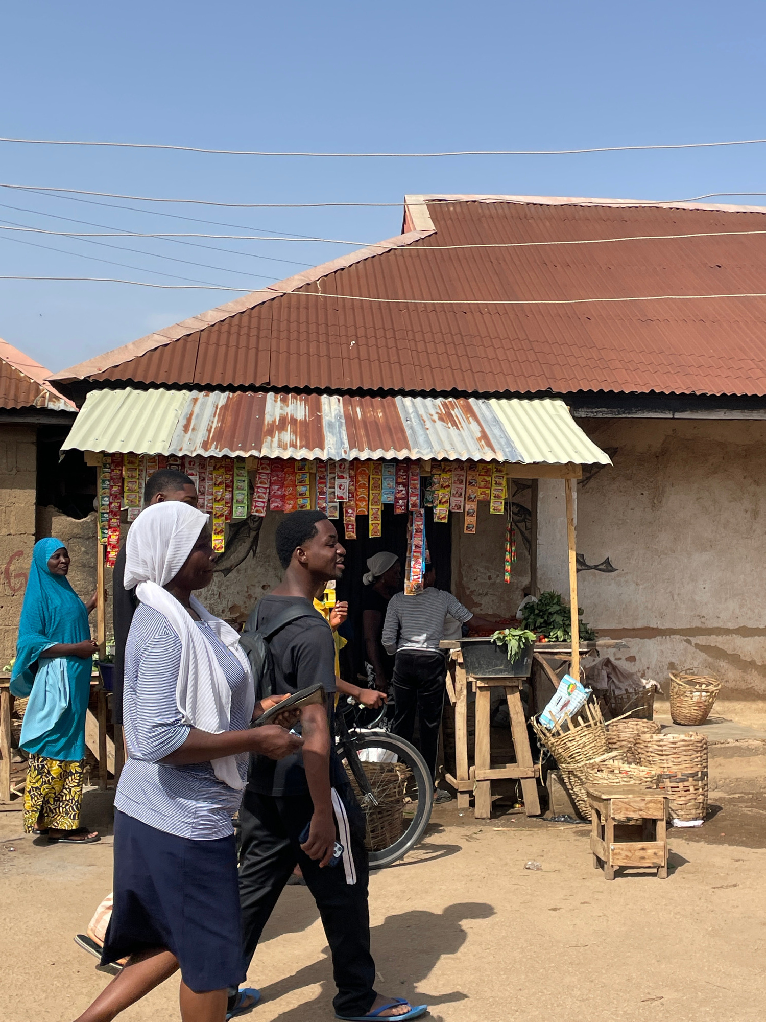 This image captures a vibrant street market scene in Jos, Nigeria, under a bright, clear blue sky. The setting features a rustic building with a rusty, corrugated metal roof and an unpaved, dusty grou…read more