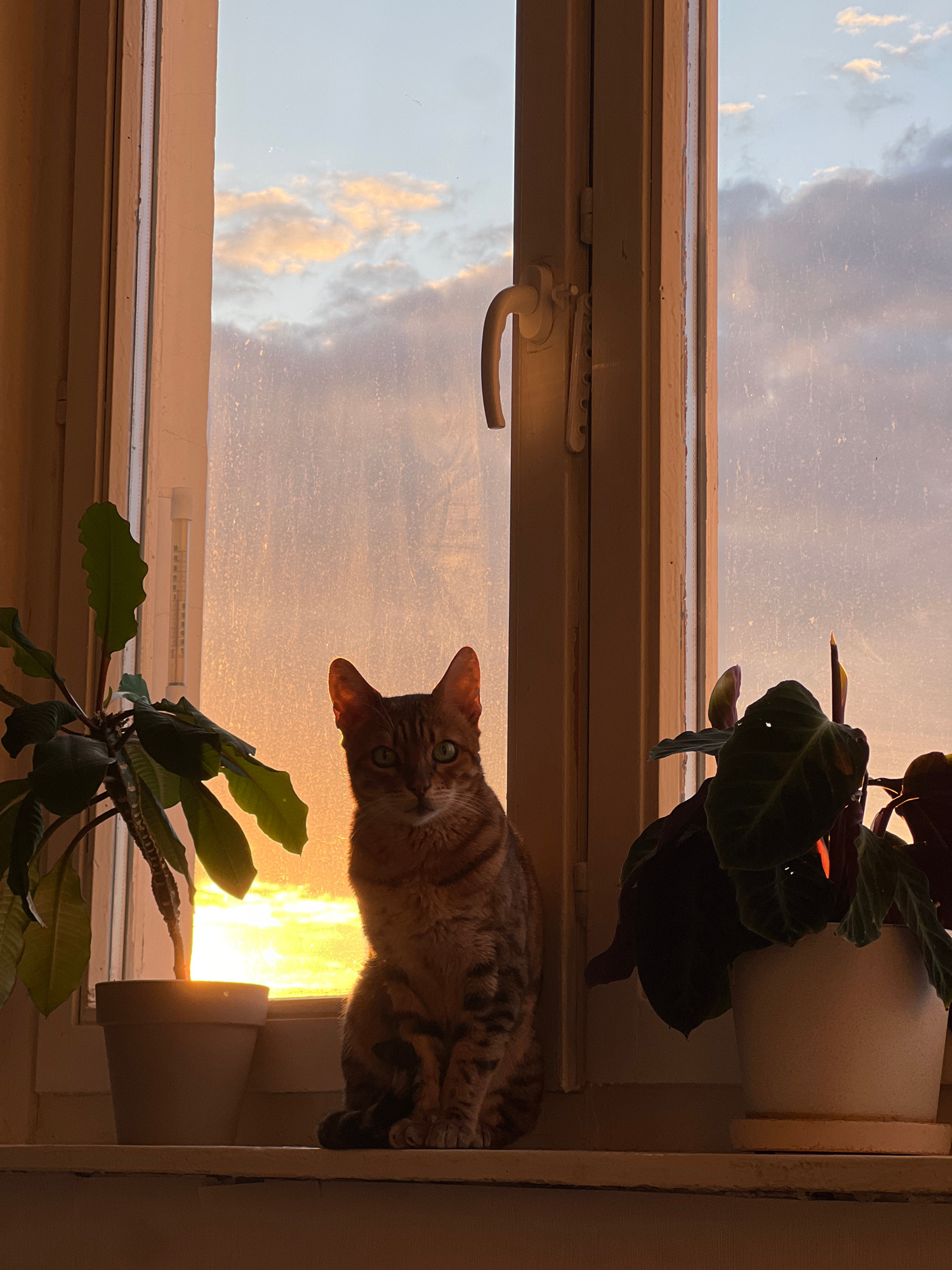 A cat is sitting on a windowsill, with a view of the sky outside. The sky is a mix of blue, white, and orange, suggesting it is either sunrise or sunset. There are two plants on the windowsill, one on…read more